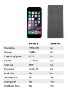 Posledným na zozname je produkt známy pod označením NoPhone. NoPhone síce nepatrí medzi typické príslušenstvo, ale nepatrí ani do kategórie smartfónov. Ide o projekt, ktorý bol pred 3 rokmi zverejnený na Kickstarteri. Jeho úlohou je odtrhnúť vás od virtuálneho života a socializovať vás viac v skutočnom svete. Žiadny displej, žiadna pamäť, žiadny fotoaparát, proste nič, čo by ste čakali. NoPhone je len kusom čierneho plastu bez akýchkoľvek rušivých funkcií v tvare podobajúcom sa aktuálne predávaným smartfónom. V tomto prípade, musíme autorov za originalitu aj myšlienku pochváliť. Pokiaľ by ste uvažovali o jeho objednaní, na obrázku nižšie uvádzame všetky potrebné parametre v priamom porovnaní s konkurenčným iPhone 6.