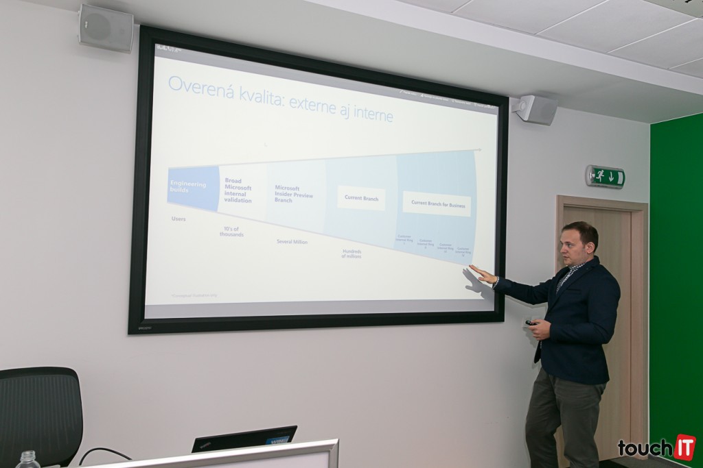 Existuje asi 5000 vývojárov, ktorí vyvíjajú nové funkcie a jadro operačného systému Windows 10. Keď sú nové funkcie schválené, prichádzajú k 200 000 zamestnancom Microsoftu, ktorí používajú rozličný hardvér. Ak nové funkcie odsúhlasia, potom prichádzajú ďalej k Insiderom. Tých je niekoľko stoviek miliónov a od nich sa využívajú telemetrické dáta. To je mimoriadne silná spätnú väzba pre vývojárov. Až po zapracovaná pripomienok sa nové funkcie prinášajú bežným používateľom. Ako sme spomínali, biznis používatelia si môžu inštaláciu nových funkcií odsunúť o 8 mesiacov.