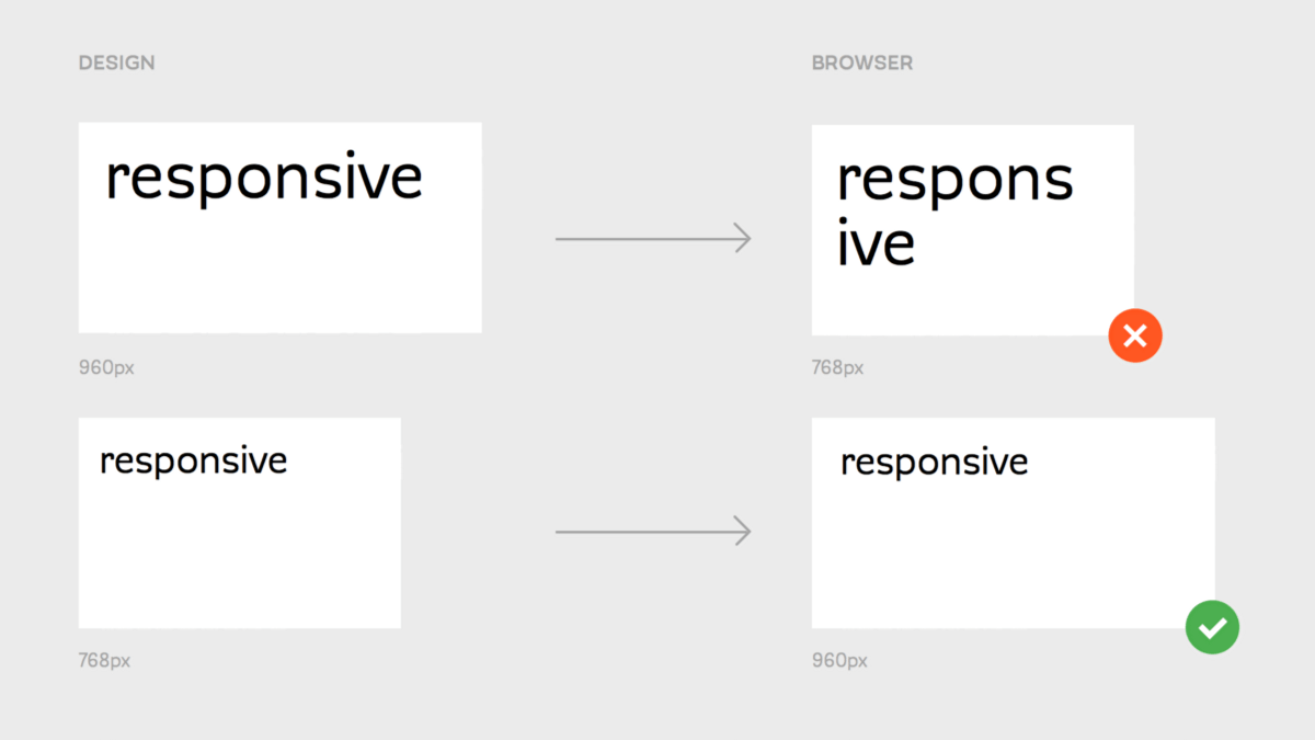 Ak teda napríklad dizajnujeme pre breakpoint 640px – 959px, pracujeme s dizajnom v najmenšej možnej šírke, teda 640px. V opačnom prípade riskujeme chyby, ku ktorým dochádza pri zmenšovaní stránky a na ktoré sa často príde až počas programovania.