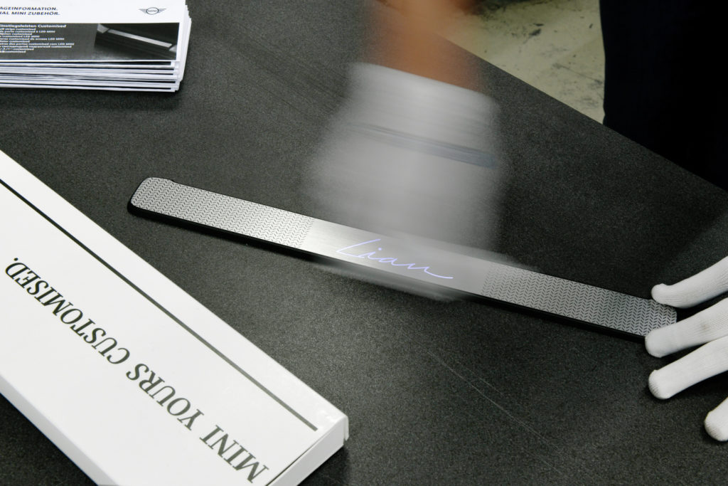 Osvetlené prahy dverí z programu MINI Yours Customised slúžia na pritiahnutie pohľadu vodiča a pasažierov MINI pri otvorení dverí. Zákazníci majú možnosť voľby medzi verziou z lešteného a čierneho hliníka a medzi viacerými prispôsobiteľnými základnými vzormi. Do celkového návrhu možno pridávať aj ikony z rôznych dizajnových okruhov. Vodič vozidla MINI tak môže na tomto vlastnom výrobku MINI Yours Customised zanechať doslova vlastný kreatívny podpis. Textové pole môže používateľ vyplniť podľa vlastného želania svojím menom alebo textom veľkými písmenami a vo forme svojho vlastného podpisu. Návrh vytvorený používateľom sa aplikuje pomocou špičkovej laserovej technológie. Individuálne konfigurovateľné prahy dverí sa dodávajú v počte podľa konkrétneho modelu – dva v prípade 3-dverových modelov MINI a kabrioletov MINI, alebo štyri v prípade 5-dverových modelov MINI a nového MINI Clubman. Možno ich presne pripevniť na konkrétne miesto pomocou dodávaných lepiacich podložiek. LED obloženia dverí MINI do dverí vodiča a spolujazdca majú LED osvetlenie bez akýchkoľvek káblov. Ich osvetlená plocha sa aktivuje magnetickým spínačom pri otvorení dverí. Ten je súčasťou objednávky, rovnako ako napájacie batérie vrátane dvoch rezervných a nástroje potrebné na montáž a demontáž. Okraje zadných dverí nie sú osvetlené. Počas konfigurácie má zákazník možnosť navrhnúť každý z dvoch alebo štyroch okrajov dverí samostatne.