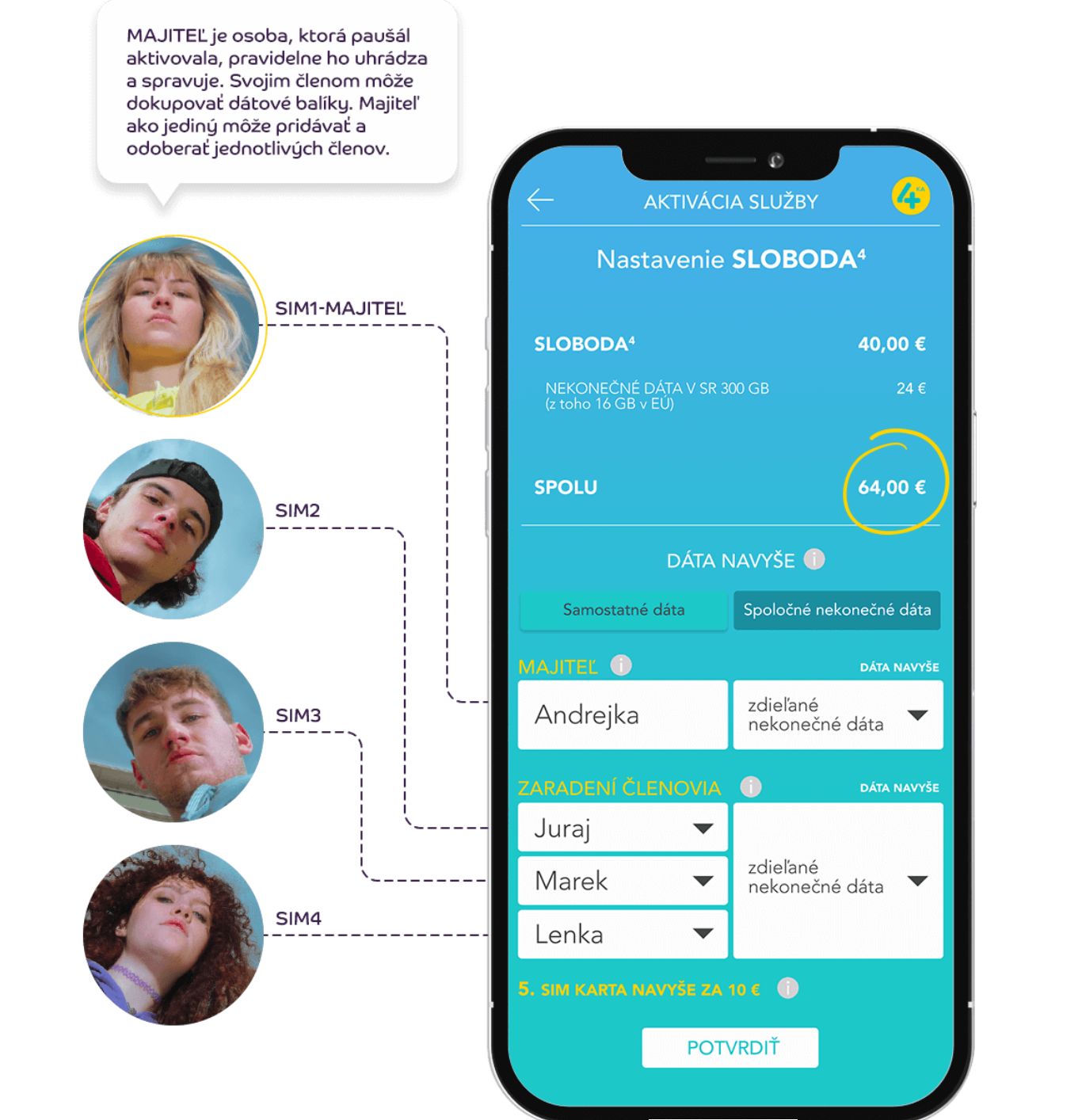 O zložení členov v paušále SLOBODA4 rozhoduje jeho majiteľ. Ten môže aktivovať doplnkové balíčky pre celú skupinu, resp. jednotlivých členov a uhrádza paušál a extra balíčky – napr. platobnou kartou. 4ka upozorňuje, že poplatok vo výške 40 eur/30 dní za paušál SLOBODA4 je uvádzací počas prvého mesiaca. Následne sa mesačný poplatok zvýši na 44 eur.