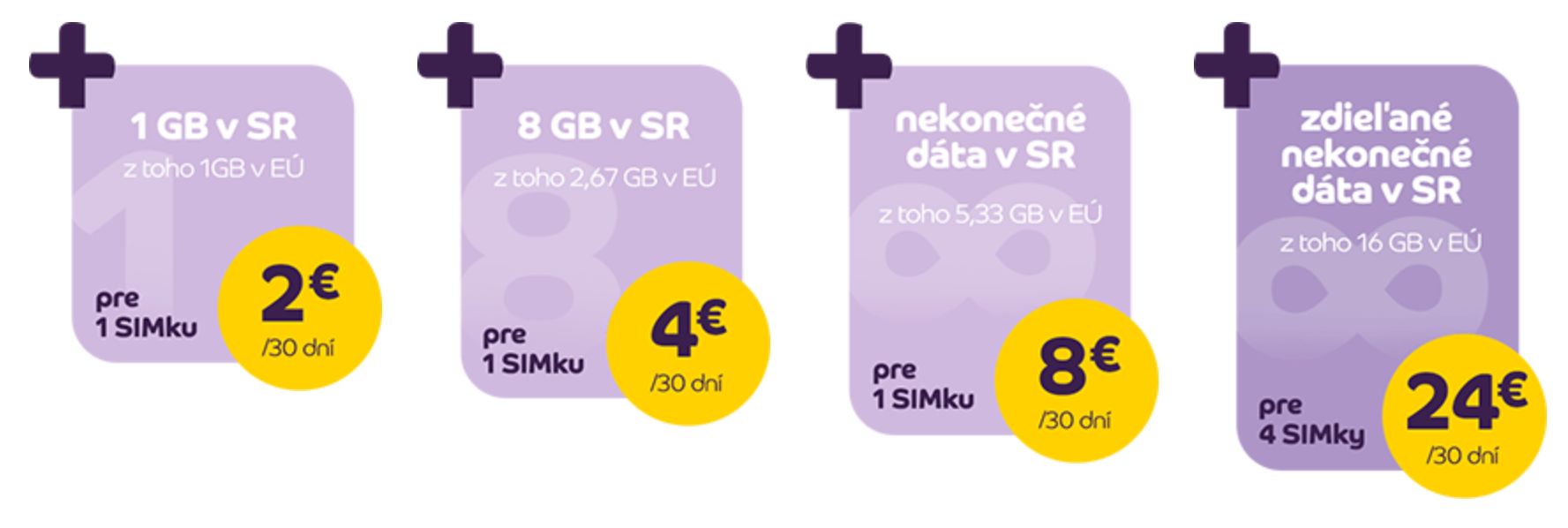 - 8 GB pre 1 SIMku v SR (z toho 2,67 GB v EÚ) za 4 eur/30 dní