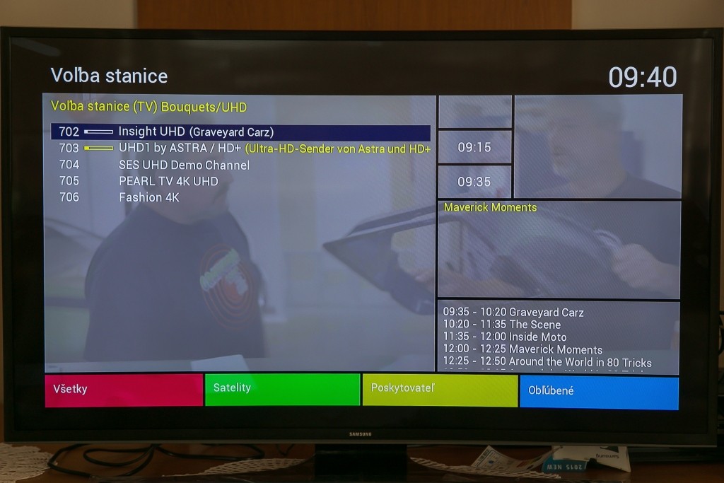 Poďme však k sľúbenému 4K vysielaniu – ide o stanice Insight UHD, UHD1 by Astra, SES UHD Demo, PEARL TV 4K a Fasion 4K. My sme si na test tohto prijímača požičali 4K televízor od firmy Samsung a nastavenie výstupu obrazu nastavili na magických 2160p. Upozorňujeme, že na prepojenie prijímača s televízorom treba použiť dodávaný HDMI kábel, ktorý podporuje prenos takéhoto obrazu.