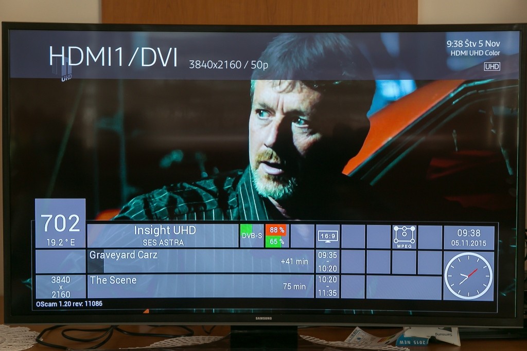 Takto sme sa dostali k obrazu, ktorý je v rozlíšení 3840 × 2160 a prehrával sa plynulo (na kódovacej karte sme povolili vysoký tok dát). Vysokú kvalitu obrazu je možné okamžite spoznať, naozaj je to rozdiel voči Full HD, keďže v tomto prípade sa zobrazuje 4-násobne viac bodov. Neskôr sme však rovnaký obraz zobrazili aj na Full HD televízore a aj tu je vidno rozdiel. Aj keď tento televízor nedokázal zobraziť plné rozlíšenie, kvalita zdroja je natoľko vysoká, že aj tu má prijímač s podporou 4K rozlíšenia význam. Využijete ho teda aj vtedy, ak ešte 4K televízor nemáte.