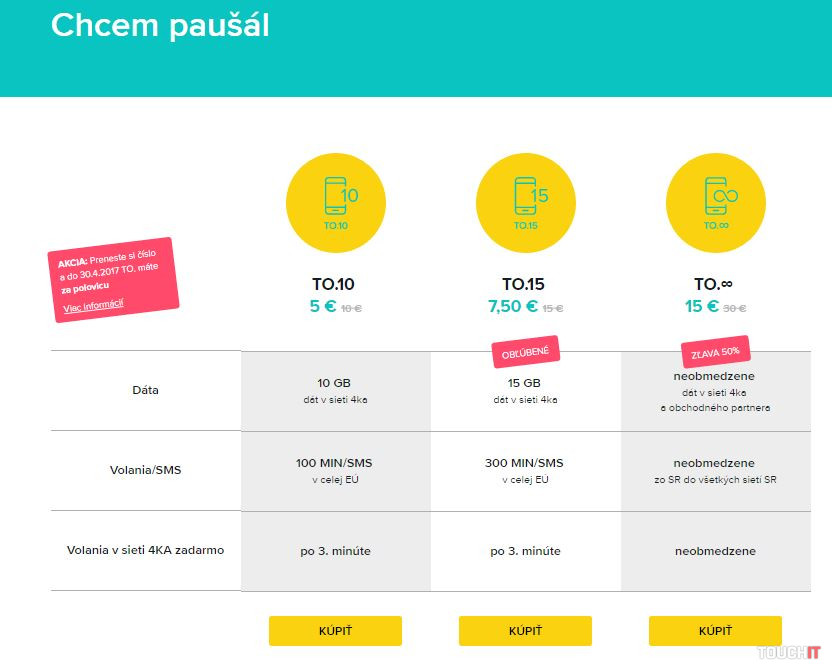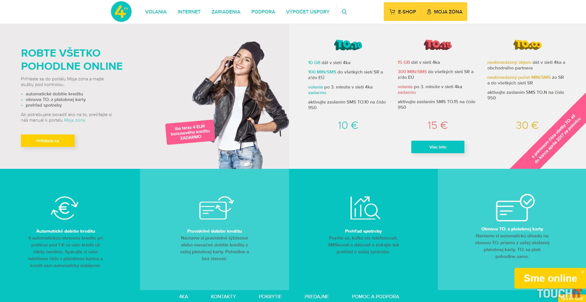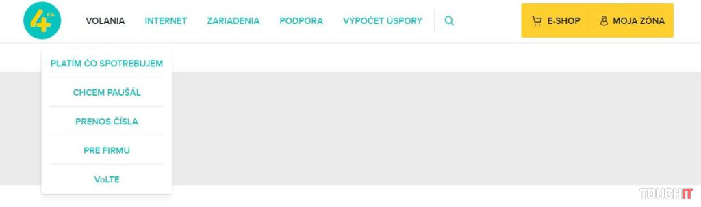 Na webe 4ky tak po novom nájdete položky Volania, Interneta Zariadenia, ktoré sú delené do ďalších podsekcií. V prípade volaní sú napr. dostupné sekcie Platím, čo spotrebujem a Chcem paušál. Prvá menovaná odkazuje na predplatenú SIM kartu Moja 4ka s jednotnou cenou 4 centy za minútu / SMS / 1 MB. Kliknutie na možnosť Chcem paušál zobrazí ponuku balíčkov TO. Z určitého hľadiska je zábavné, že 4ka na webe odkazuje na balíčky TO. práve použitím slova paušál, pretože na tlačových konferenciách sa v minulosti tomuto spojeniu vyhýbala. Operátor vždy tvrdil, že TO. nie je paušál a že TO. predstavuje niečo lepšie, ako je paušál.