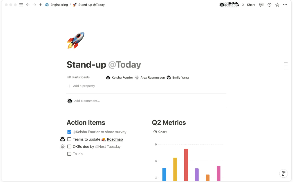 Ideálny na spoluprácu medzi viacerými používateľmi, možnosť integrácie so službami Slack, GitHub a ďalšími. Silnou stránkou je možnosť využiť priestor poznámky na vkladanie grafov, obrázkov, previazaných udalostí, to-do zoznamov atď. Taký Microsoft OneNote s výrazne modernejšou zásobou funkcií a princípom práce s množstvom poznámok.