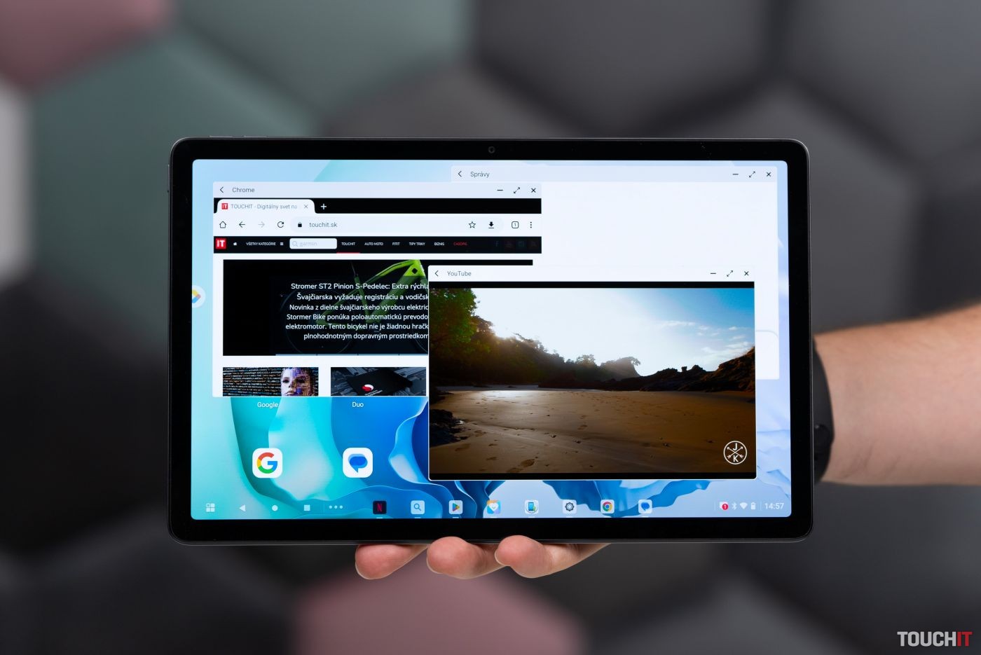 V rozhraní Pracovného režimu môžete používať jednotlivé aplikácie v oknách, čo uľahčuje prácu s viacerými aplikáciami súčasne. K tabletu si môžete zakúpiť aj oficiálnu klávesnicu od Lenova, ktorá sa pripojí cez Pogo rozhranie a ponúka CZSK usporiadanie klávesov.