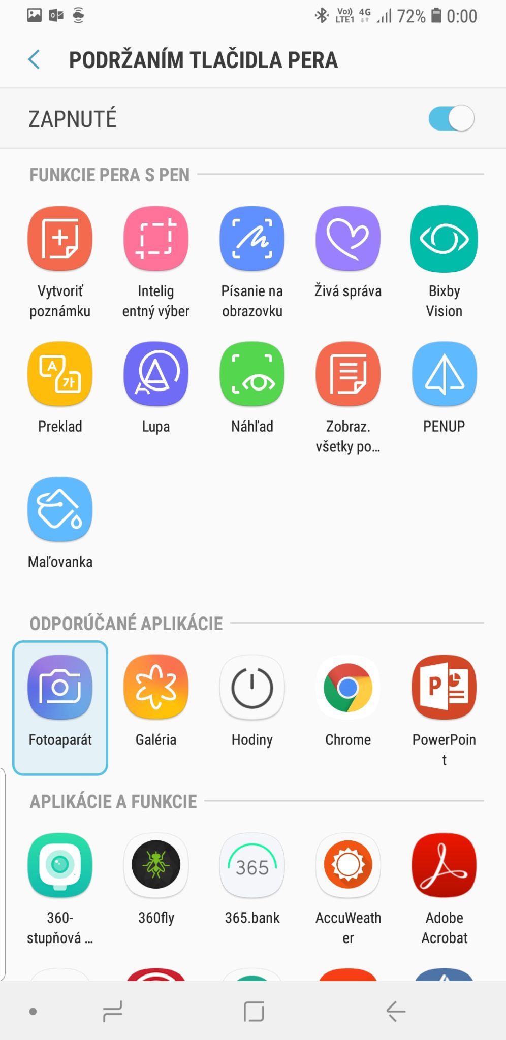 Pero je v prípade Galaxy Note9 iné, ako v predchádzajúcich verziách. Je pripojené pomocou Bluetooth a to znamená, že sa s perom dá robiť viac ako doteraz. Využijete ho ako diaľkovú spúšť fotoaparátu alebo ako ovládač na premietanie fotiek z galérie či slidov z prezentácie a tiež pri prehrávaní hudby na preskakovanie skladieb. O tom, čo bude pero robiť rozhodujete vy a príslušné voľby nájdete v položke Nastavenia – Pokročilé funkcie – Pero S Pen. Voľbou Diaľkový ovládač S Pen zistíte, ako je to s batériou v pere a hlavne určíte, čo sa má robiť, keď potlačíte tlačidlo na pere. Vybrať si môžete aj to, čo sa stane, keď potlačíte tlačidlo na pere vo vybraných aplikáciách.