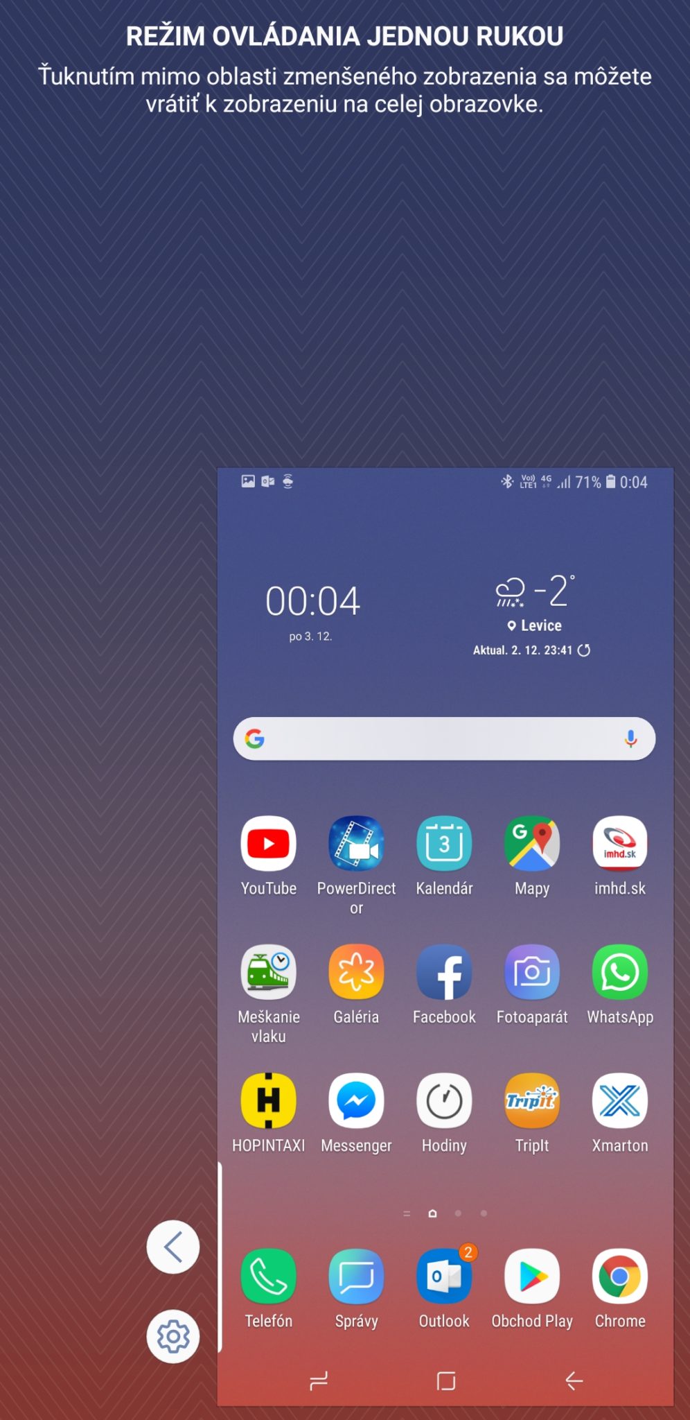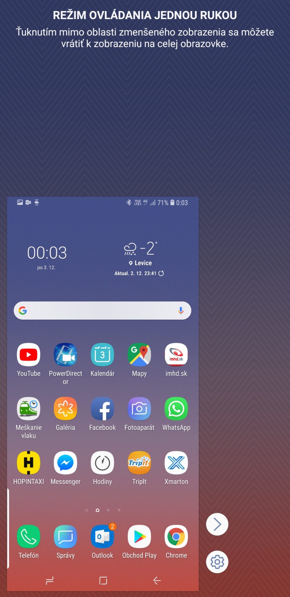 Keďže je tu veľký displej, ovládanie jednou rukou môže byť problém. Ten sa dá ľahko vyriešiť v Nastavení, kedy si povolíte Režim ovládania jednou rukou. Nájdete ho v Nastavenia – Pokročilé funkcie. Vybrať si môžete aktiváciu tohto režimu Gestom alebo trojitým stlačením tlačidla Domov. Nám sa viac oplatilo Gesto a môžete si určiť a to, na ktorej strane vznikne zmenšené okno na ovládanie telefónu. Teda vpravo alebo vľavo, podľa tohto ktorou rukou držíte telefón.