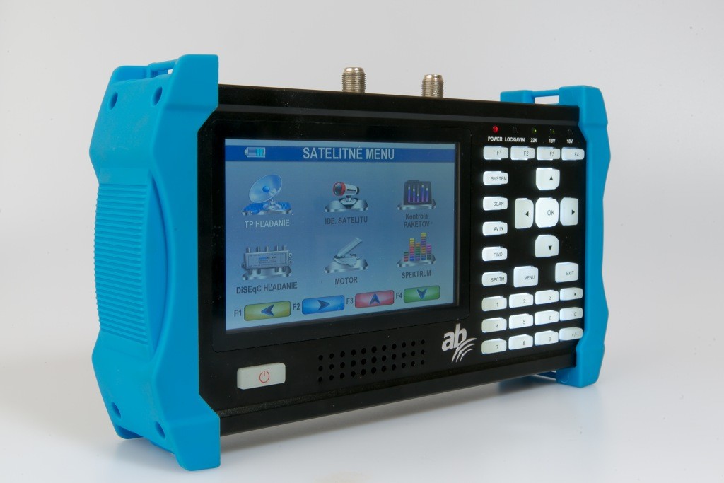 Súčasťou dodávky je ešte niekoľko adaptérov, ktoré sú užitočné pri kontrole DVB-T signálu a tiež pri pripojení audio a videovstupu. Celok sa dodáva v taške, ktorá sa dá zavesiť na rameno a máte tak voľné ruky pri pohybe napr. na streche. Nosný popruh sa dá umiestniť aj priamo na prístroj. Samotný prístroj je vyhotovený robustne, na stranách sa nachádzajú umelohmotné držadlá, ktoré tiež chránia prístroj pred porušením pri jeho náhodnom páde.  Prístroj slúži ako malý televízny prijímač, môžete na ňom sledovať nekódované vysielanie. Okrem toho poskytne ďalšie parametre prijatého signálu, je tu základný spektrálny analyzátor a konštelačný diagram. Hlavné menu sa dá zobraziť aj v slovenčine, obsahuje položky pre satelitné, terestriálne a káblové vysielanie, sledovanie televízie, nastavenie a USB manažér (ten využijete, len ak pripojíte k USB portu napr. USB kľúč). Najčastejšie sa tento prístroj bude používať na nastavenie satelitu a tomu sme sa pri našom teste venovali najviac. Môžete si napr. zistiť, kam je satelit nastavený, vo veľkom zobrazení tiež vidíte kvalitu príjmu, môžete kontrolovať prijaté pakety, vyhľadať nastavenia DISEqC, resp. pripojeného motora a analyzovať spektrum prijatého signálu. Spektrum sa dá uložiť ako obrázok na USB kľúč. Zistíme tiež presné informácie o vyhľadanom transpondéri: pomer C/N, MER – modulačnú chybovosť, preBER, postBER, silu signálu a moduláciu. Je tu aj funkcia, ktorá po zadaní aktuálnych súradníc vypočíta azimut a eleváciu.