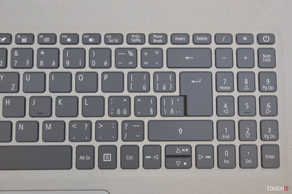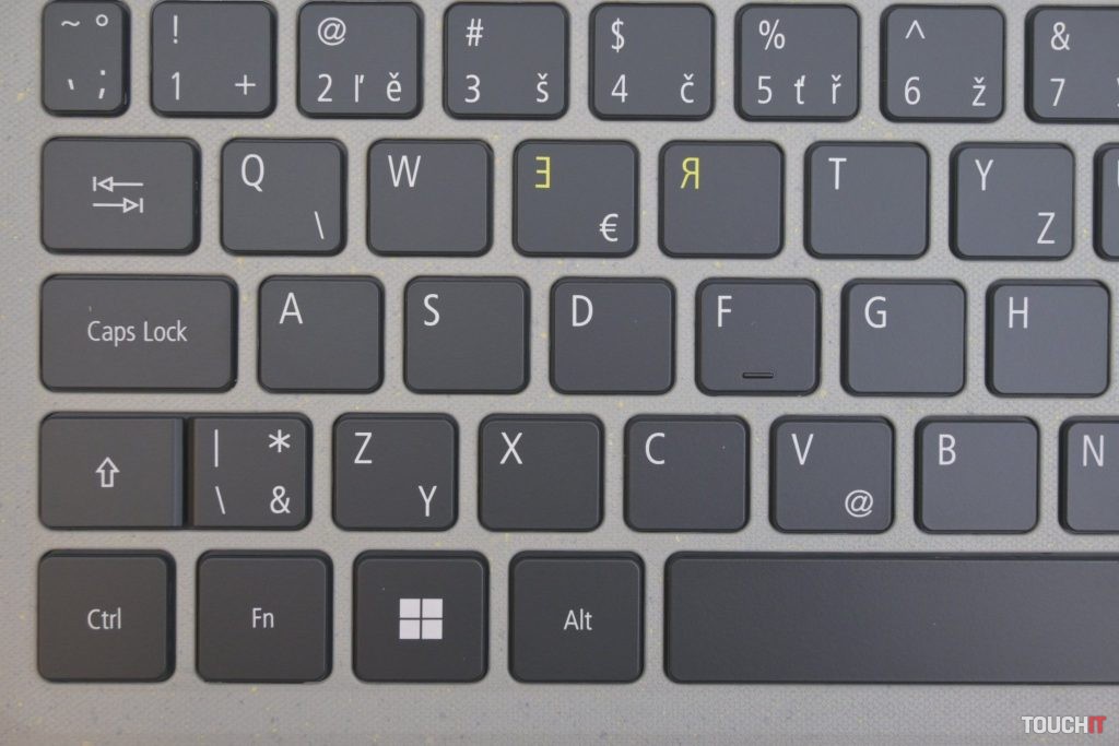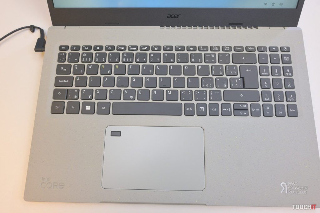 Klávesnica má jedno špecifikum a to otočené písmená E a R do opačného smeru. Je to zároveň znak alebo akýsi symbol tejto série zameranej na recyklované materiály. Klávesnica má jeden stupeň podsvietenia. Zvykať si treba na užší numerický blok a zarovnanie niektorých klávesov, typicky som si málil lomku s mínusom. Čítačka odtlačkov je zabudovaná v touchpade tak, ako ste to už videli pri viacerých notebookoch tejto značky.