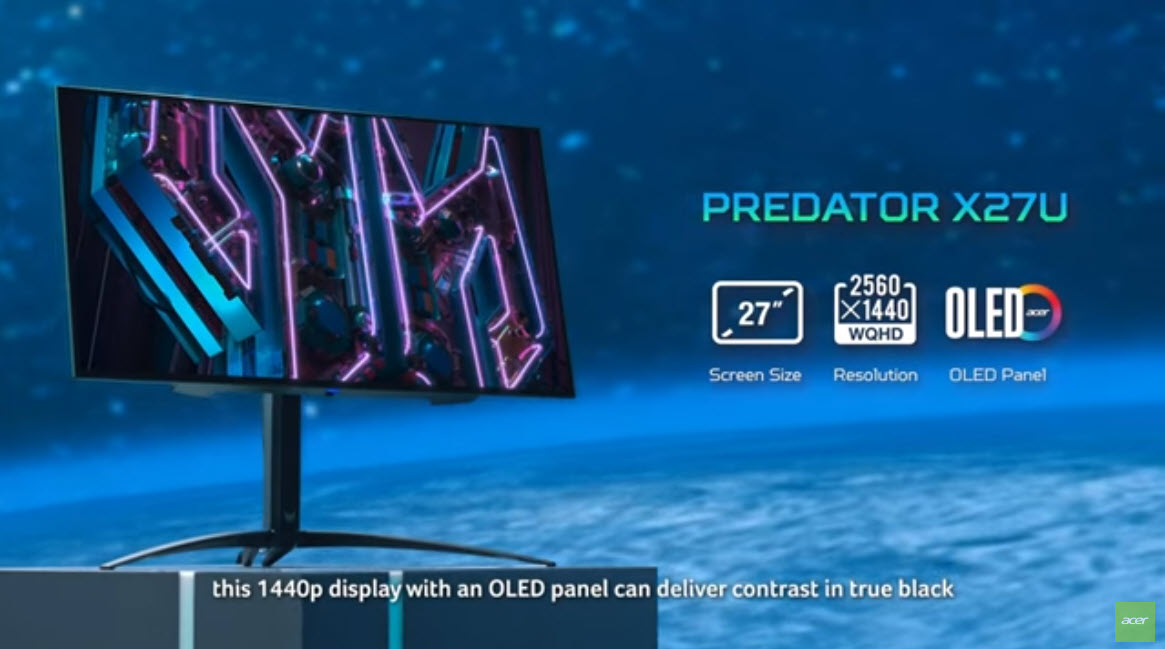 Monitor Predator X45 prichádza so skutočne obrovským až 45 palcovým OLED panelom, ktorý je navyše zakrivený. Rozlíšenie je UWQHD (3440 × 1 440 px). Herný monitor Predator X27U s 27-palcovým panelom OLED s rozlíšením WQHD (2560 × 1 440 px), obnovovacou frekvenciou 240 Hz a časom odozvy len 0,01 ms je vhodným riešením pre hráčov, ktorí s reakciami nesmú meškať.