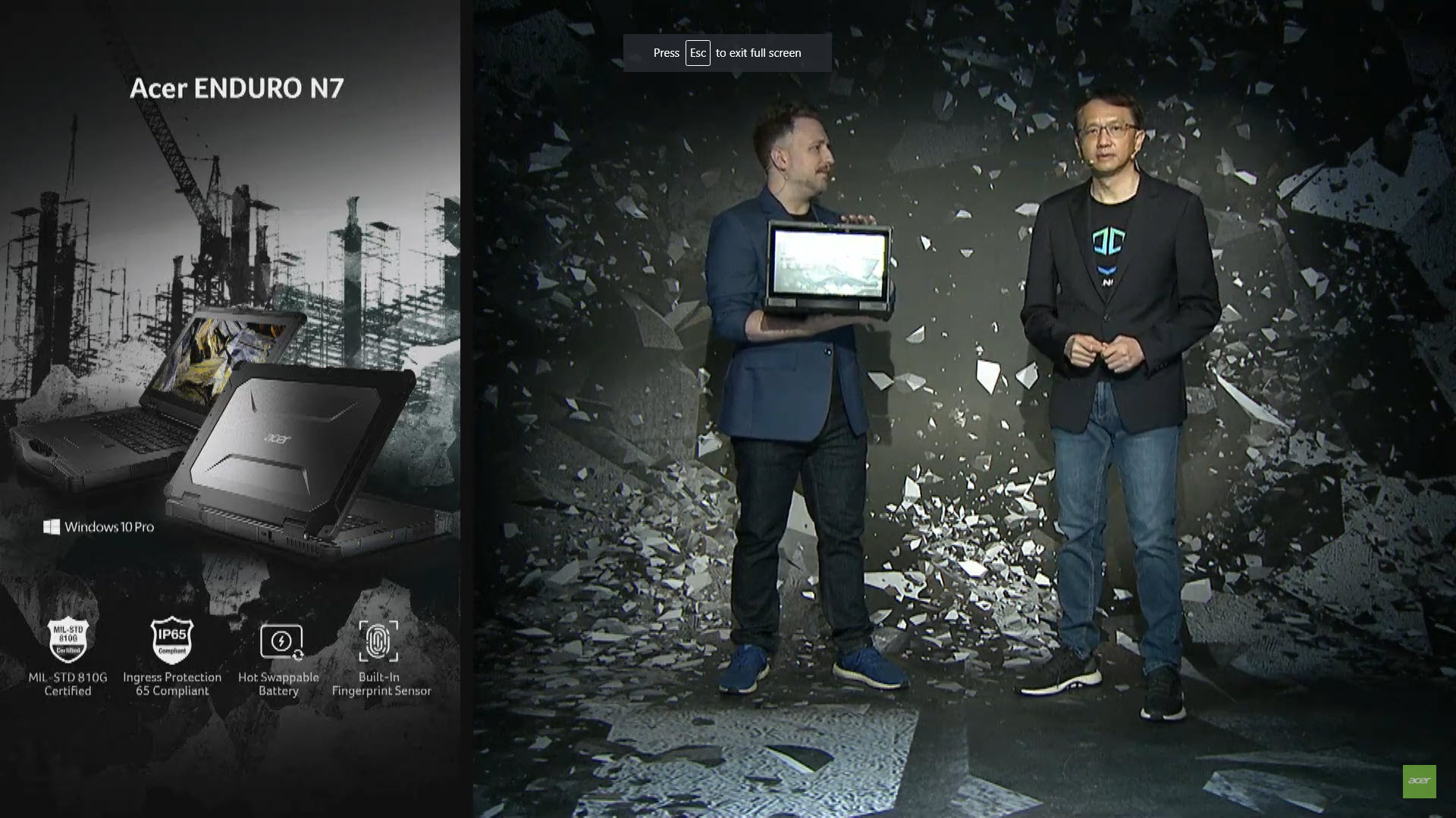 Acer Enduro N7 je robustný notebook konštruovaný z materiálov absorbujúcich nárazy. Ponúka spoľahlivosť, ktorý potrebujú pracovníci v prvej línii, v teréne aj v priemyselnej výrobe. Toto zariadenie sa môže pochváliť vojenským certifikátom odolnosti MIL-810G a krytím IP65, bolo skonštruované tak, aby odolávalo pádom aj na najtvrdšie podlahu a prenikaniu prachu i vody. Vďaka tejto odolnosti ide o zariadenie vhodné na prácu za horúca aj za zimy a jeho 14-palcový Full HD displej s jasom 700 nitov ponúka vynikajúci obraz za rôznych svetelných podmienok. Pre naozaj dlhé pracovné dni je Enduro N7 dodávaný s dvoma batériami: jedna batéria s dlhou až 10 hodinovou výdržou je vymeniteľná za prevádzky a druhá je trvalo zabudovaná.