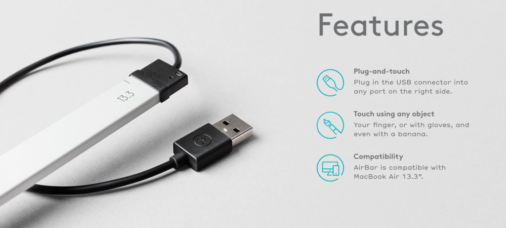 AIRBAR je zaujímavé zariadenie, lišta, ktorá premení nedotykový displej vášho MacBook-u Air na dotykový, a to v úplnej jednoduchosti. Hovoríme len o zariadení MacBook Air, nakoľko je zatiaľ iba tento model podporovaný. Výrobca však plánuje, resp. vyvíja AIRBAR aj pre zariadenia PRO, ktoré majú užšiu lištu pod displejom, čo je zatiaľ hlavným problémom.