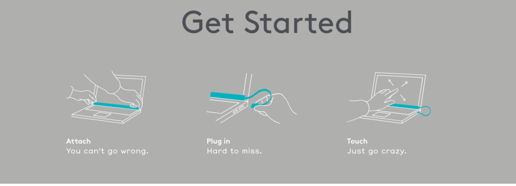 Ako to funguje? Je to plug-and-touch zariadenie, z čoho vyplýva – zapojte a používajte, bez akéhokoľvek softvéru, zariadenie funguje samostatne. Lišta drží na zariadení pomocou dvoch magnetov. Napájanie a komunikácia s notebookom prebieha cez USB port na pravej strane, čo je jediná možná (správna) inštalácia. Kábel je síce trošku neestetický, subjektívne, ale ak chcete dotykový AIR, bude vám to jedno.