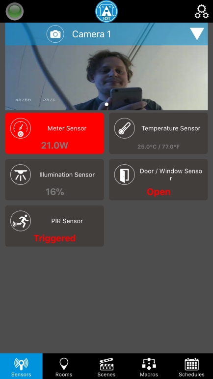 Ak aplikácii odpustíme jednoduchý dizajn, úvodná obrazovka s informáciami obsahuje všetko potrebné – prístup k obrazu z kamery, informácie o teplote a osvetlení v izbe, údaj o spotrebe z inteligentnej zásuvky a stav dverového a pohybového senzora. K dispozícii je aj história stavov pre jednotlivé senzory a komponenty, čo chválime.
