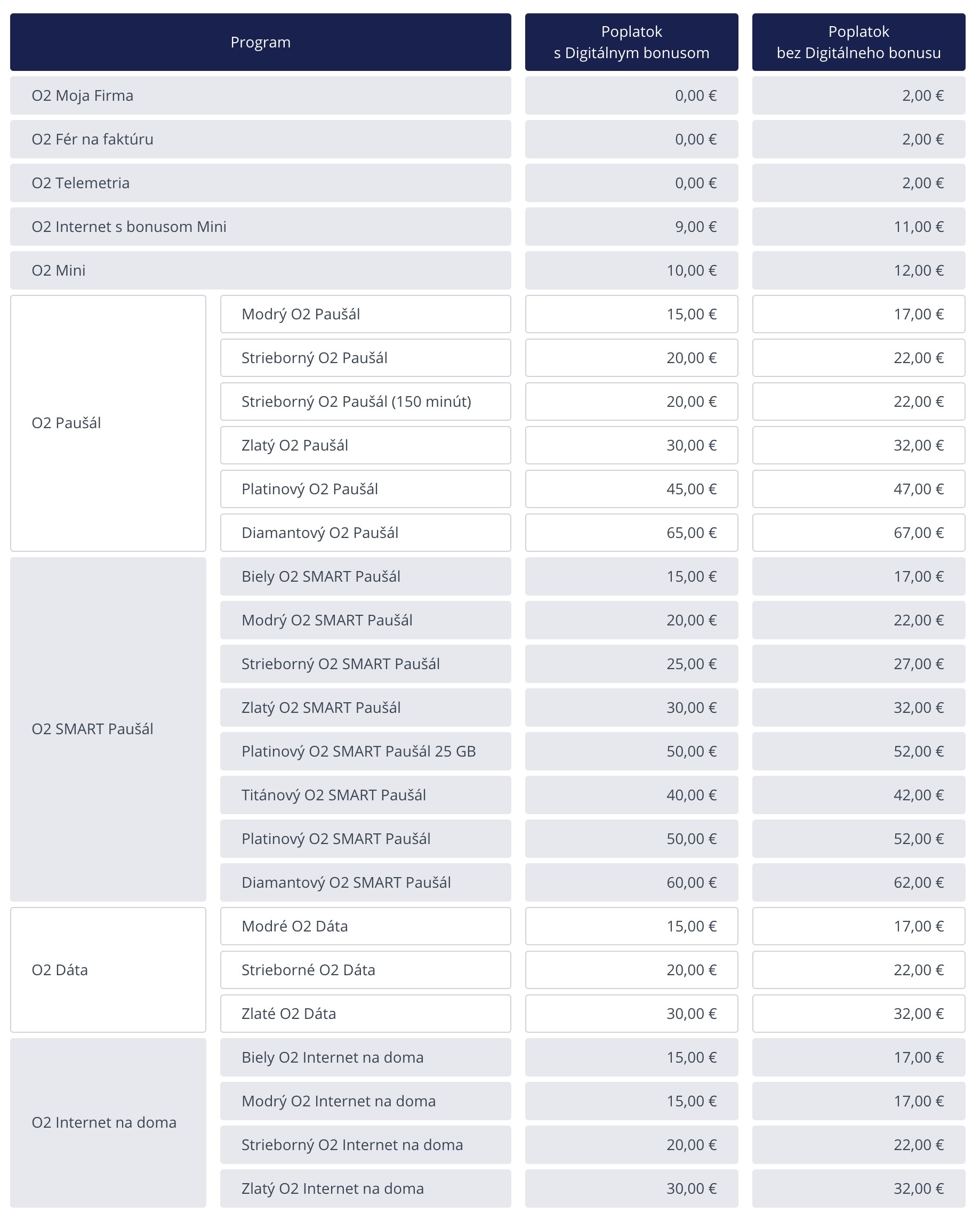 O2 s platnosťou od 29. júna mení svoj cenník tak, že bude zvlášť uvádzať ceny s Digitálnym bonusom a zvlášť ceny bez Digitálneho bonusu. V prípade ak zákazníci splnia kroky na uplatnenie Digitálneho bonusu, zmena sa ich nedotkne.
