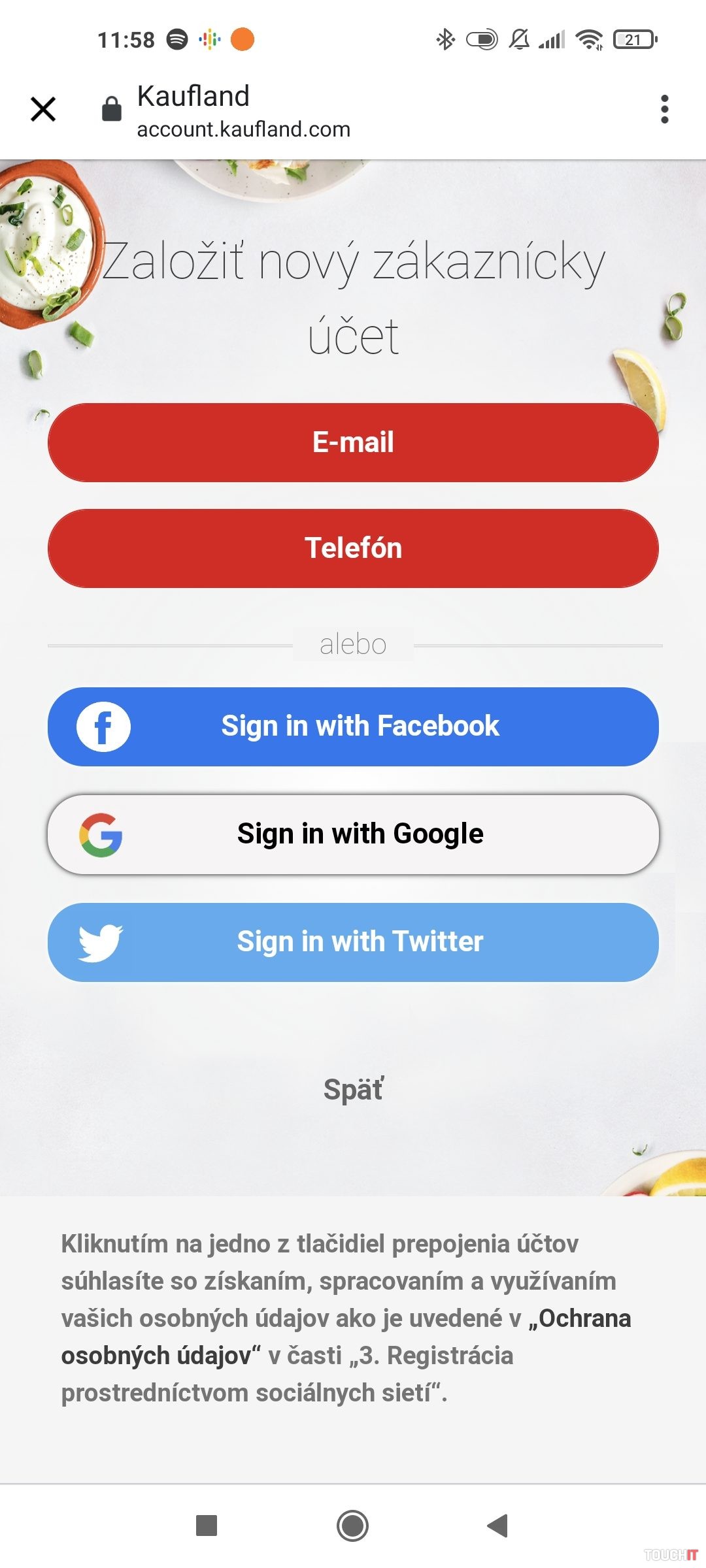 Po spustení ťuknite v spodnej časti na ikonu Účet a zobrazia sa možnosti registrácie. Na zjednodušenie procesu môžete použiť Google, Facebook alebo Twitter. Bude treba vyplniť vašu adresu, či už trvalý pobyt alebo tú, kde sa nachádzate najčastejšie (napríklad prechodný pobyt, práca).