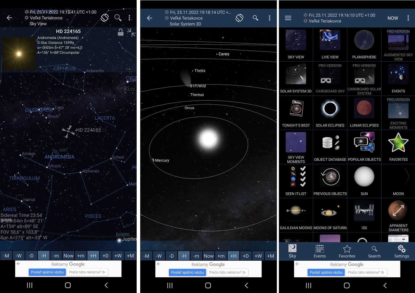 Bohužiaľ, v bezplatnej verzii sú niektoré funkcie zamknuté a obsahuje otravné reklamy na celú obrazovku. Na odomknutie niektorých funkcií je možné pozrieť si krátke reklamné video. K dispozícii sú ale aj samostatné aplikácie Mobile Observatory 2 a 3, ktoré stoja každá 4,99 eura. Pre iOS táto aplikácia opäť nie je, preto ako alternatívu odporúčame Night Sky.