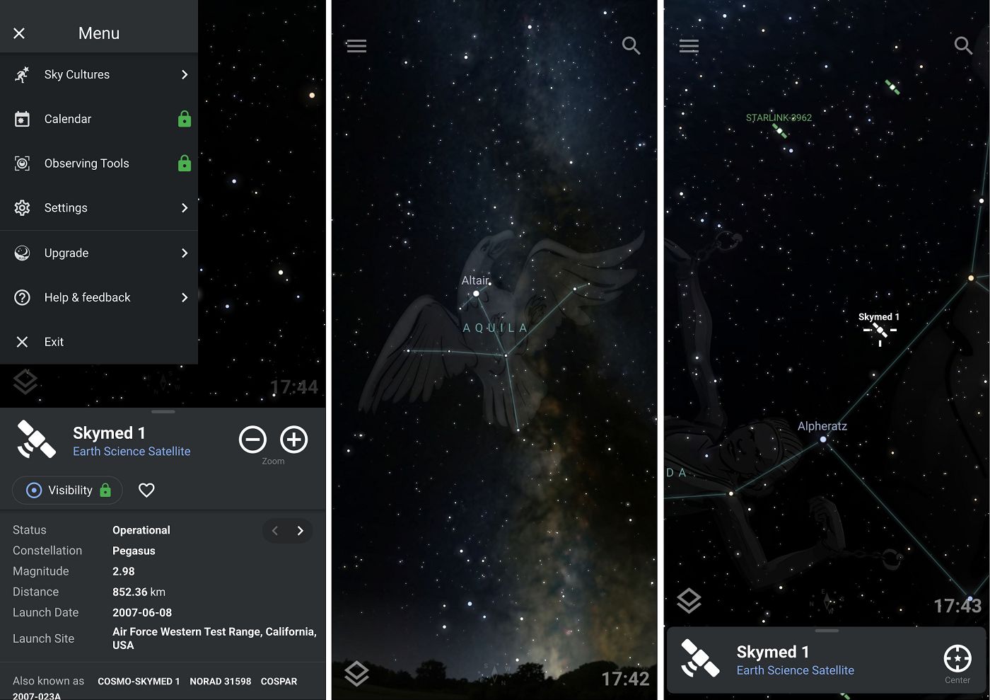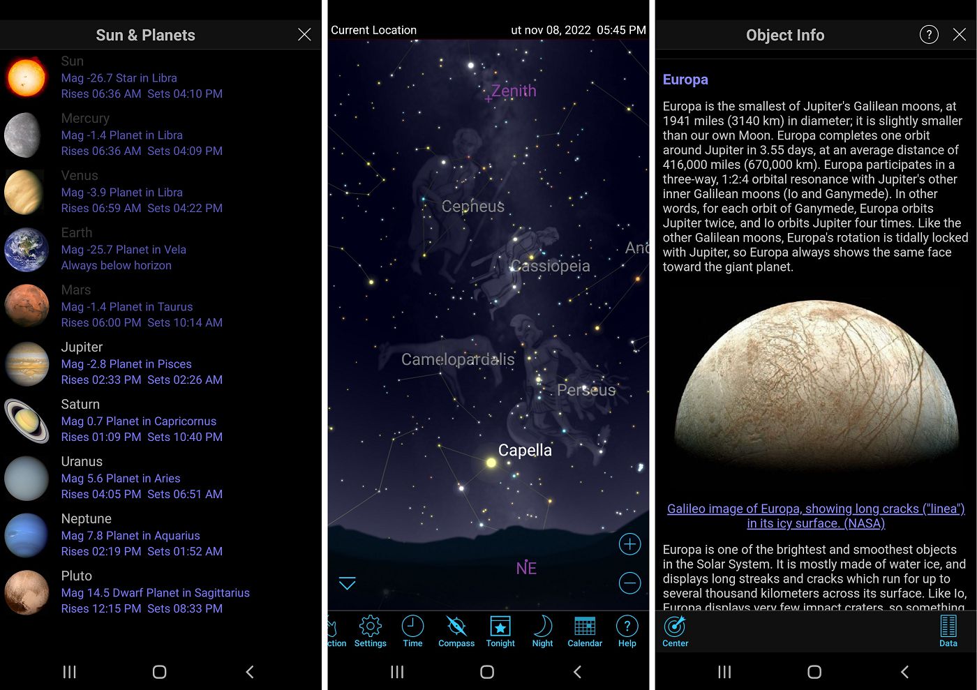 Toto je jedna z najstarších aplikácií svojho druhu pre operačný systém Android. Kedysi bola známa ako Google Sky Map, dnes je to už len proste Sky Map. Jej používanie je jednoduché, stačí otáčať telefónom okolo seba a na displeji sa vám zobrazujú rôzne vesmírne telesá v tej časti oblohy, na ktorú namierite telefón.