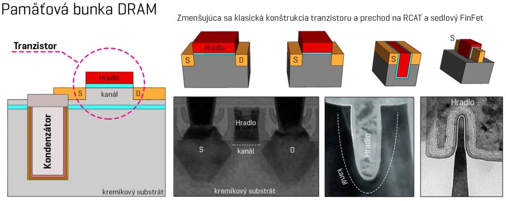 Ako sa tranzistor DRAM s novým výrobným procesom zmenšoval, ploché hradlo malo stále väčší problém kanál ovládať. Najprv sme to vyriešili prechodom na RCAT konštrukciu s ponoreným hradlom, kde elektrónom pribudla vertikálna cesta a neskôr prechodom na dnešný S-FinFET, pri ktorom je maličký kanál možné ovládať vďaka tomu, že ho hradlo obkročí tak ako sedlo. Na snímke z elektrónového mikroskopu môžete vidieť (vpravo dole), ako kanál v podobe rebra prechádza vnútrom sedlového hradla.