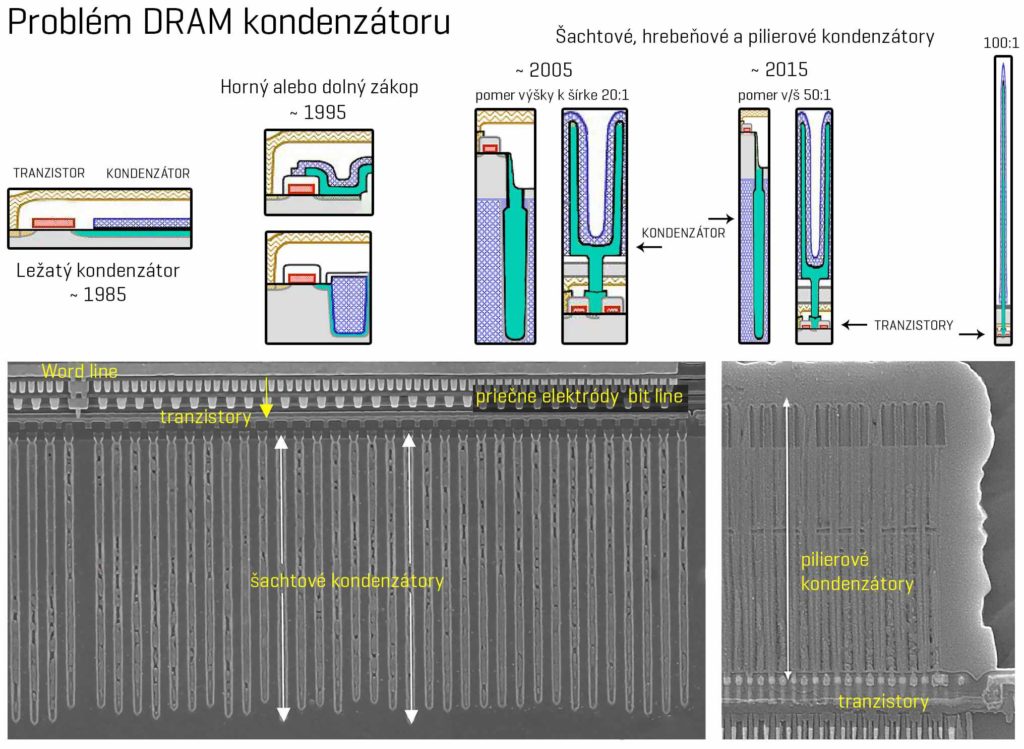 Vývojári DRAM s týmto problémom zatiaľ bojujú tak, že materiál kondenzátoru pri horizontálnom zmenšovaní čoraz viac naťahujú do výšky. V súčasných a v roku 2020/21 nasadzovaných výrobných procesoch DRAM (18 / 12 nm) sa blížime k tomu, že pomer výšky kondenzátora k jeho šírke je už takmer stonásobný. Ako je vidieť na schematickom obrázku, už nie je príliš možné tento koncept viac naťahovať, pretože sme sa dostali na hranicu štrukturálnej stability a takisto toho, ako tenký materiál dokáže udržať náboj bez nežiaducich únikov.