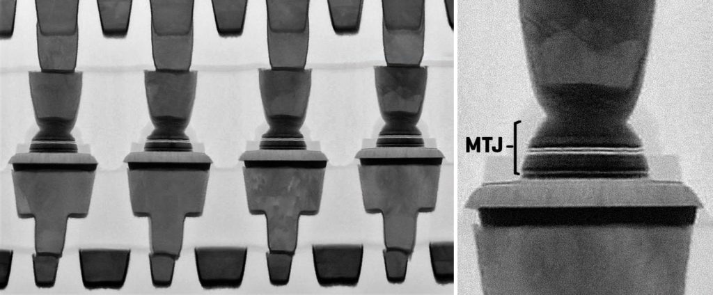 Bočný pohľad na zástup MRAM buniek od Intelu. Elektrónovým mikroskopom sa pozeráme na elektródy vystupujúce z FinFET tranzistorov (zákryt v dolnej časti), ktoré smerujúce do Word Line, pričom v strede elektród je dobre vidieť MTJ prvok