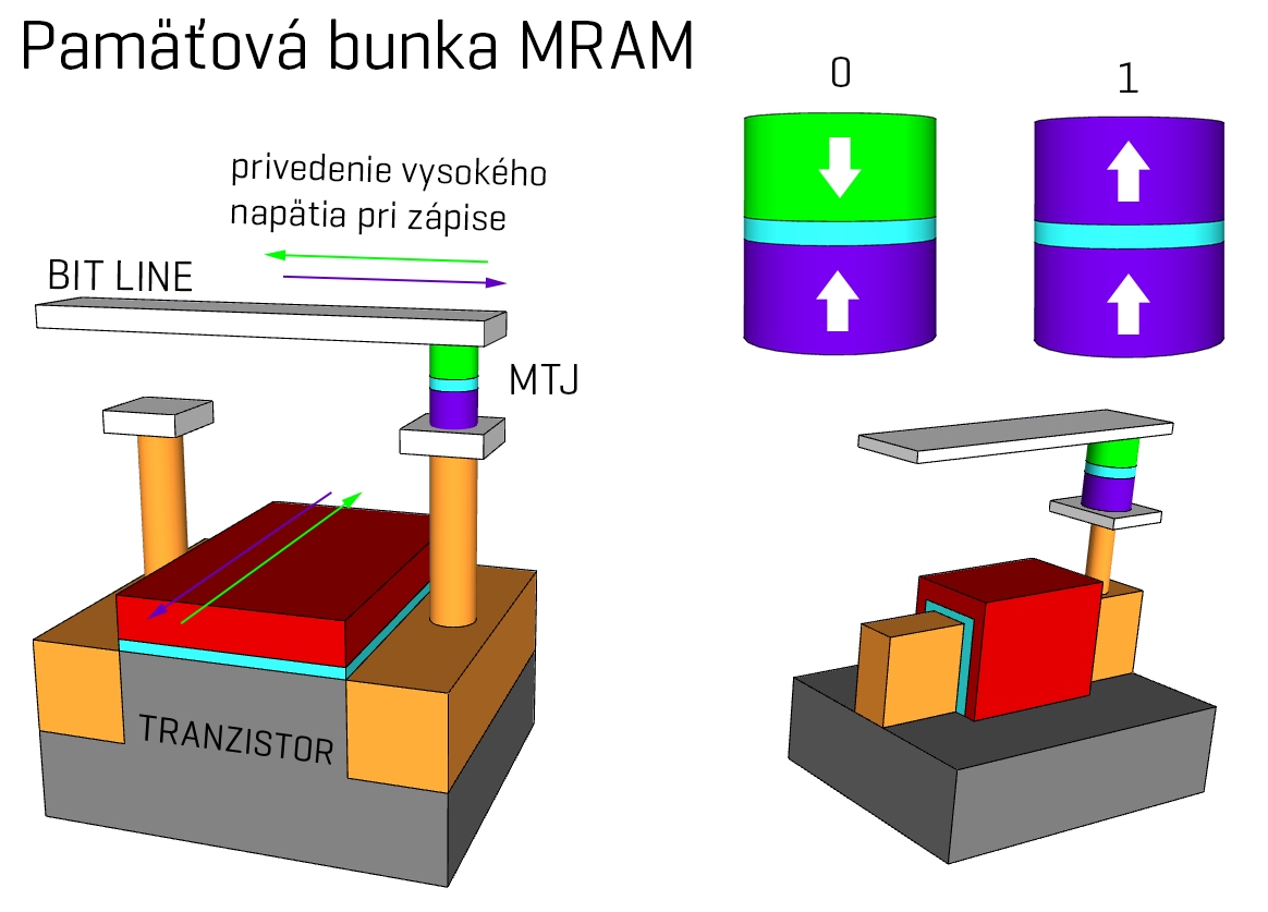 Bunka STT-MRAM tvorená magneticko tunelovacou spojkou (MTJ), v ktorej sa otáča spin elektrónov a tranzistorov (klasickým vľavo alebo FinFET vpravo)
