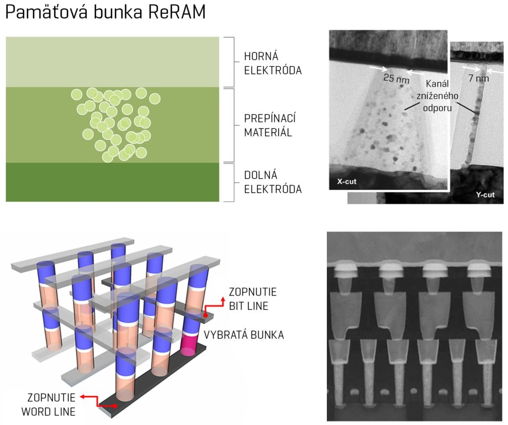ReRAM bunku je s ideálnym materiálom možné prevádzkovať aj samotnú. V praxi si ale pri jej ovládaní pomáhame tranzistorom, takže bunka pripomína MRAM. Reálnu konštrukciu vidieť vpravo dole s tranzistormi na dne a „hamburgerovým“ ReRAM prvkom na elektródach. Vľavo hore vidieť v materiáli na povel preskupené molekuly kyslíka, ktoré vytvárajú cestu so zníženým odporom