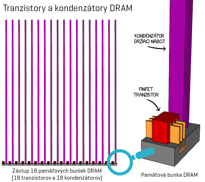 Na schematickom obrázku si môžete pozrieť, že tranzistor vyzerá koncepčne tak trochu ako domček. Na jeho bokoch sú elektródy (source a drain), pričom tok elektrického prúdu medzi nimi, a teda zapínanie a vypínanie tranzistora, kontrolujeme elektrickým poľom aplikovaným na hradlo (odizolovaná strieška domčeka). Tento koncept je celkom totožný s tranzistormi logických výpočtových obvodov (CPU, GPU), avšak keďže tranzistor použitý v DRAM má trochu iné požiadavky na prácu, vývojová alternácia tejto konštrukcie šla trochu iným smerom.