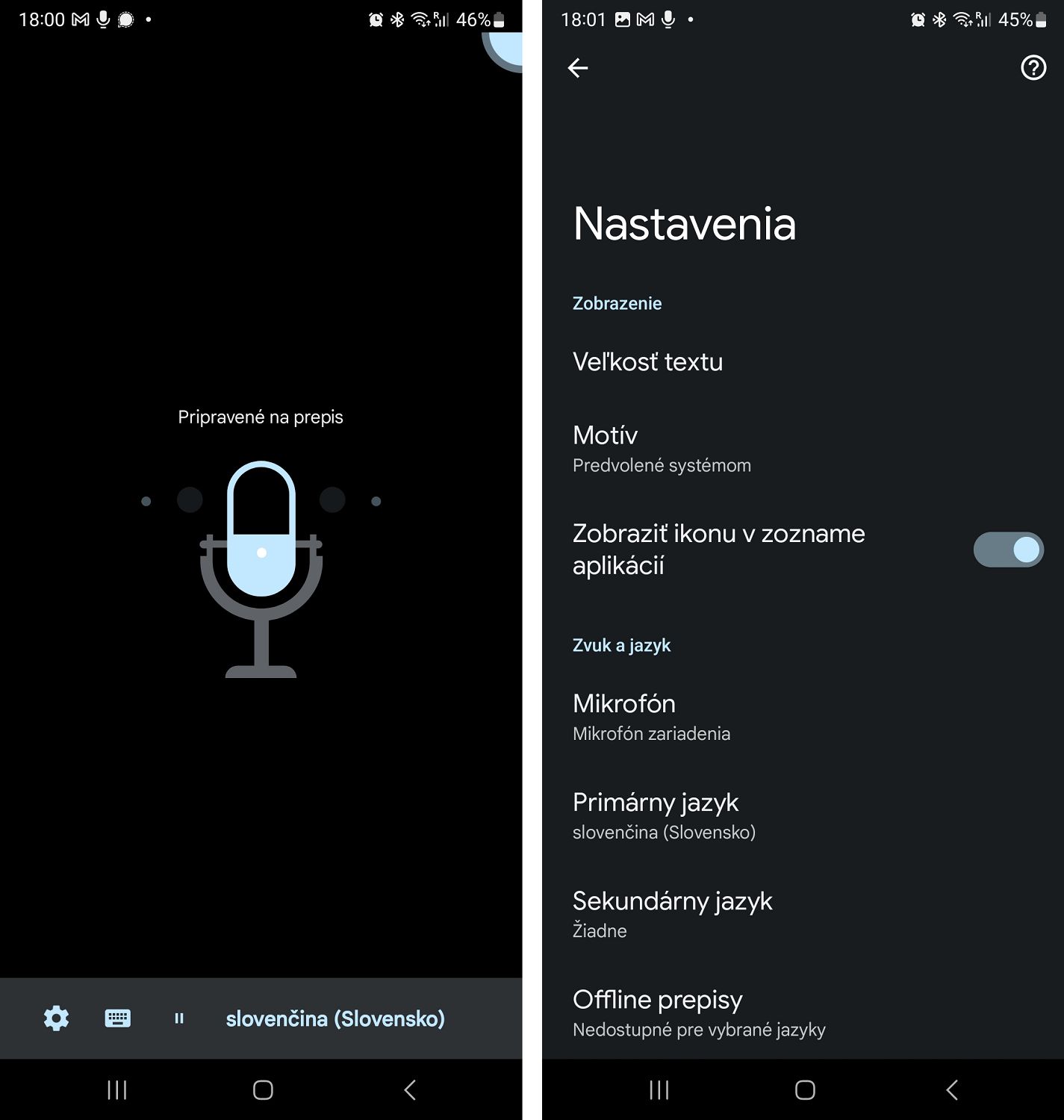 Keďže Beey.io je platená, ako správny Slováčisko som hľadal niečo, čo by bolo zadarmo. Našiel som aplikáciu pre Android priamo od Google s názvom Okamžitý prepis. Funguje trochu inak ako Beey.io, prekladá totiž v reálnom čase, ako jej prehrávate nahrávku či rozprávate.