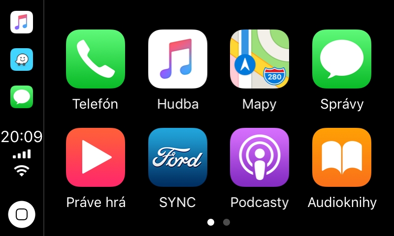 Základná obrazovka pripomína nafúknutú plochu iPhonu s aplikáciami, ktoré CarPlay podporuje. Tých nie je veľmi veľa, ale sú užitočné. V ľavom stĺpčeku vidíte naposledy používané aplikácie (rýchly prístup) a hneď pod nimi sa zobrazuje čas, intenzita mobilného a Wi-Fi signálu (ak ste pripojení) a napokon je tu aj tlačidlo „domov“, ktoré vás vždy dostane na úvodnú obrazovku. Do pozornosti dávame aj ikonu s názvom značky vozidla, ktorá slúži na návrat z tejto aplikácie do natívneho multimediálneho systému.