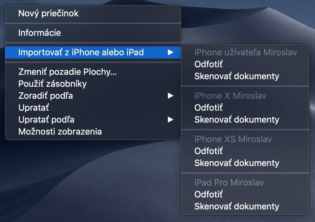 – toto je novinka, ktorá opäť rozširuje možnosti ekosystému. Ak potrebujete skenovať dokument alebo rýchlo dostať do systému macOS nejakú fotografiu, stačí vo Finderi alebo v konkrétnej aplikácii vyvolať možnosti a prejsť na položku – import z iPhonu alebo iPadu.