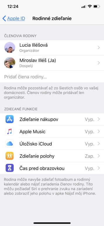 Rodina a zdieľanie – ak členovia vašej rodiny používajú Apple zariadenia, tak môžete využívať zdieľanie rôznych funkcií a aplikácií. Funguje to na základe pozvánky, ktorú vy prijímate alebo posielate. Výhodou tejto funkcie je zdieľanie nákupov v AppStore a platby z jedného účtu, možnosť využitia rodinného balíka Apple Music pre 6 členov za zvýhodnenú cenu, zdieľanie iCloud úložiska, polohy členov rodiny alebo funkcie – čas pred obrazovkou.