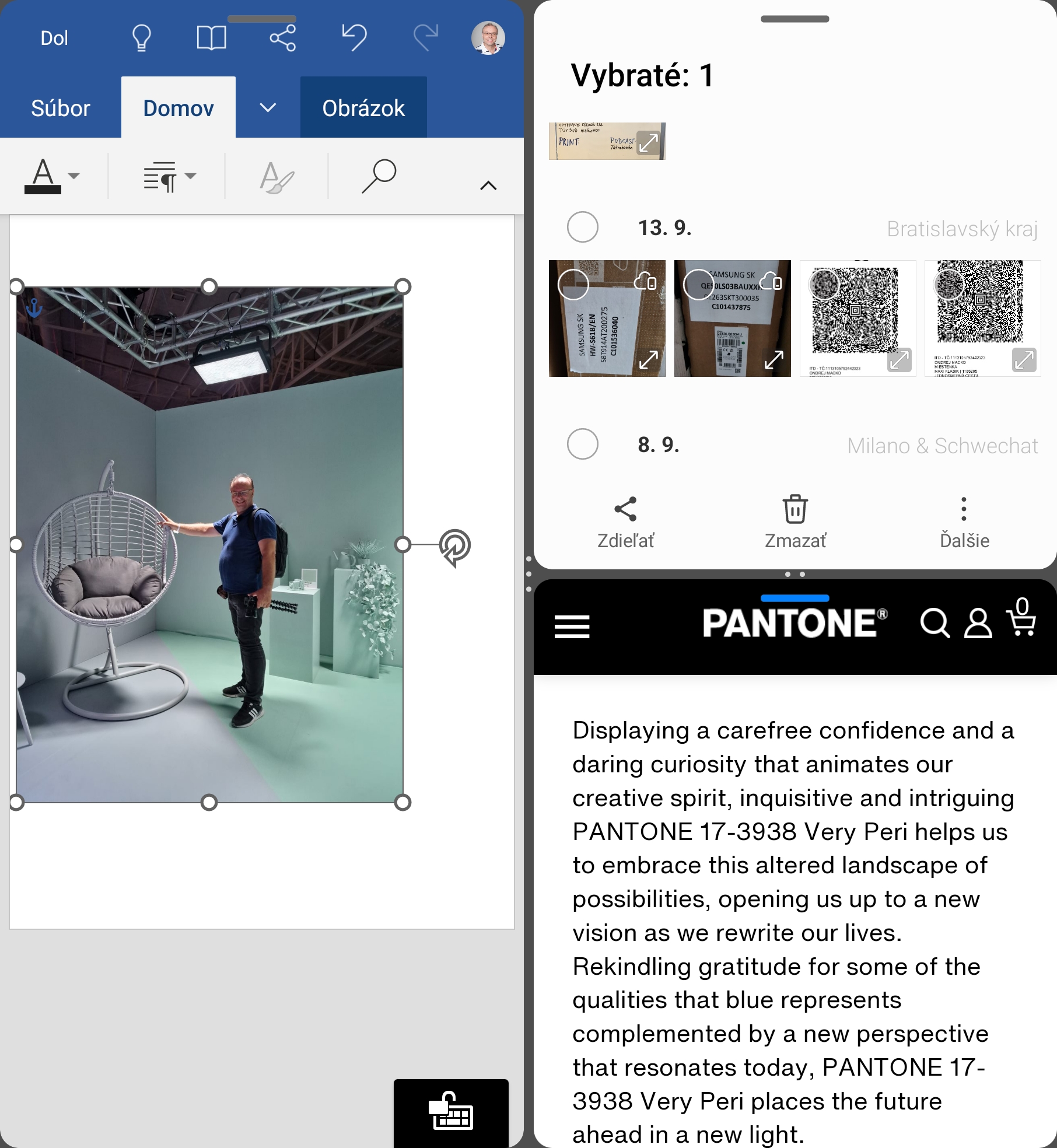 Skúsme pomocou multitaskingu vytvoriť článok vo Worde s tým, že na to použijeme fotky z galérie a text si prenesieme z nejakého internetového článku. Otvoríme si tak v prvom kroku Word a vytvoríme nový prázdny dokument. Následne z panelu úloh prenesieme do pravej časti aplikáciu Galéria a necháme si zobraziť fotografie vhodné do tohto článku.