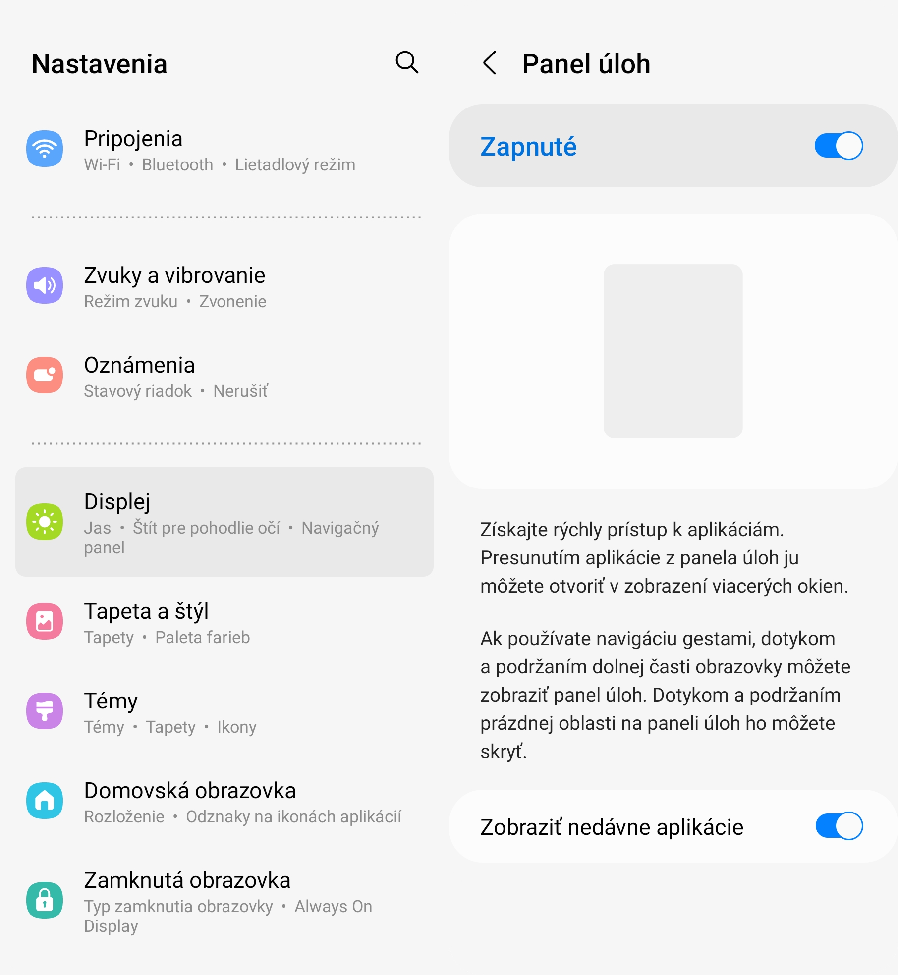Ak používate navigáciu tlačidlami, panel úloh máte zobrazený potom, ak otvoríte nejakú aplikáciu. Posunom ikony aplikácie z panelu úloh do ostatnej časti displeja sa zobrazí náhľad toho, ako bude aplikácia v režime multitasking zobrazená. Ak panel nevidíte, stačí potlačiť tlačidlo v tvare šípky v spodnej časti obrazovky. Ak používate navigáciu gestami, dotykom a podržaním dolnej časti sa zobrazí panel úloh.