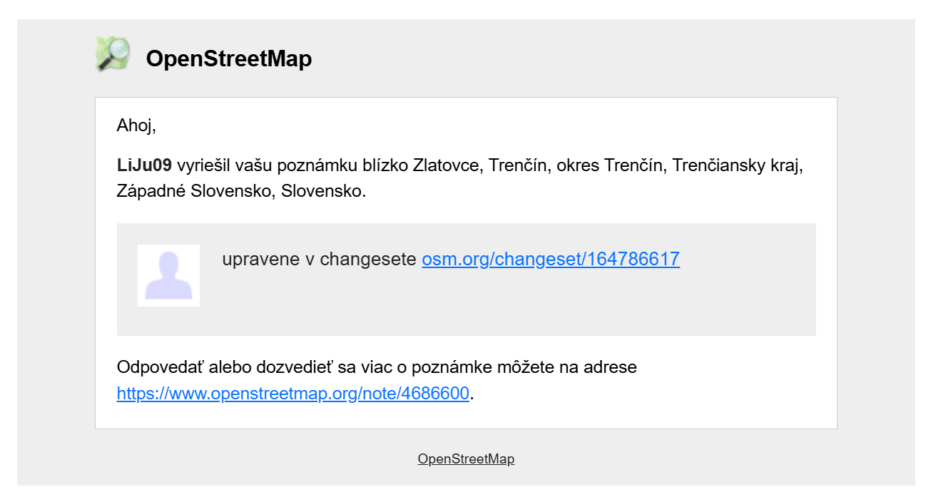 Informácie z OpenStreetMap môže preberať viacero aplikácií. Ak sa nahlási zmena z konkrétnej aplikácie, bude to v pripomienke vidieť. Po vytvorení poznámky dostanete informáciu o tom, že bola pridaná na posúdenie a po niekoľkých dňoch či týždňoch dostanete informáciu o aplikovaní zmien. Tie sú premenené do mapy vo forme poznámky, keďže prekresľovanie máp nie je možné a je potrebné počkať na nové mapové podklady.