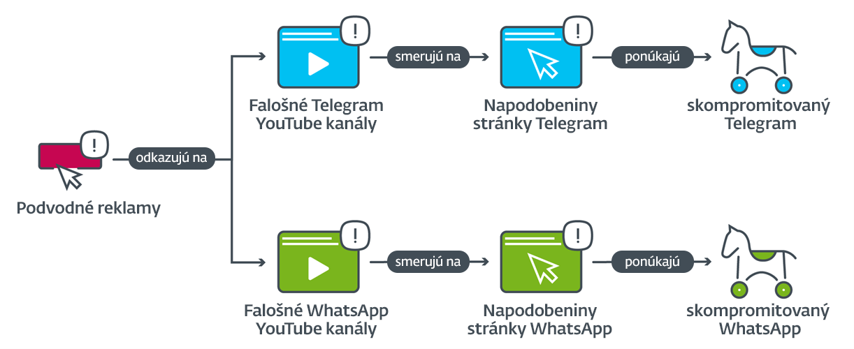 V prvom kroku útočníci vytvorili reklamy na Google, ktoré používateľov naviedli na podvodné YouTube kanály. Tie následne presmerovali návštevníkov na falošné webové stránky Telegram a WhatsApp. ESET okamžite nahlásil podvodné reklamy a súvisiace YouTube kanály spoločnosti Google, ktorá ich všetky okamžite zrušila.