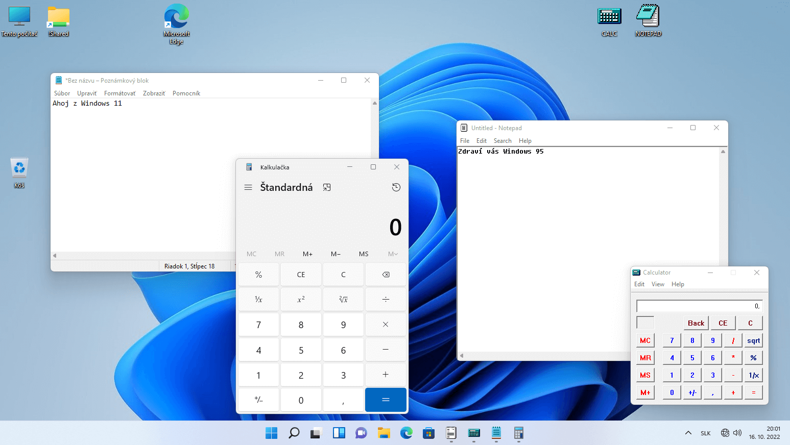 Chcete dôkaz? Pozrite sa na tento obrázok Windows 11. Vľavo sú jeho aplikácie Poznámkový blok a Kalkulačka a v pravo rovnomerné programy z Windows 95. Nie, to nie sú ich snímky obrazovky či virtualizované inštancie. To sú originálne EXE súbory, presunuté z Windows 95 na plochu Windows 11 a následne spustené dvojklikom myši.