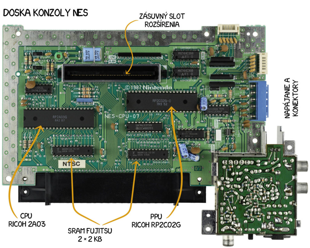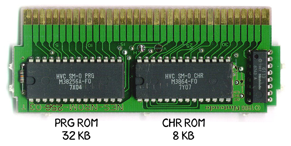 Zostalo nám 40 kB. A tieto adresy bitov, ktoré procesor mohol vidieť, boli vyhradené práve pre čipy v zásuvnom „kartridži“. Vyčerpal ich teda spomenutý 32 kB čip PRG ROM (zdrojový kód hry a zvuk) a vedľa neho sediaci 8 kB čip PRG ROM (grafické dáta).
