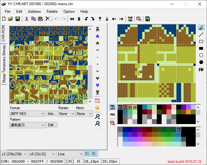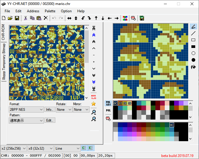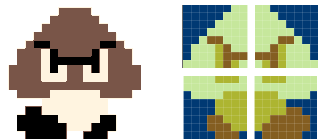 To čo na týchto obrázkoch vidíte (vľavo) je úplne všetka grafika, ktorú Super Mário používa v celej hre. Nič nie je skryté. Dohromady ide len o týchto 512 dlaždíc. Vpravo je priblíženie na 16 dlaždíc, kde už dobre rozpoznať to, že každá je zložená len zo smiešnych 64 pixelov (8 × 8), v maximálne štyroch rôznych odtieňoch. Dole môžete vidieť, že v dostupnej palete farieb je možné číslom prideliť pixelom konkrétnu farbu, alebo priehľadnosť.