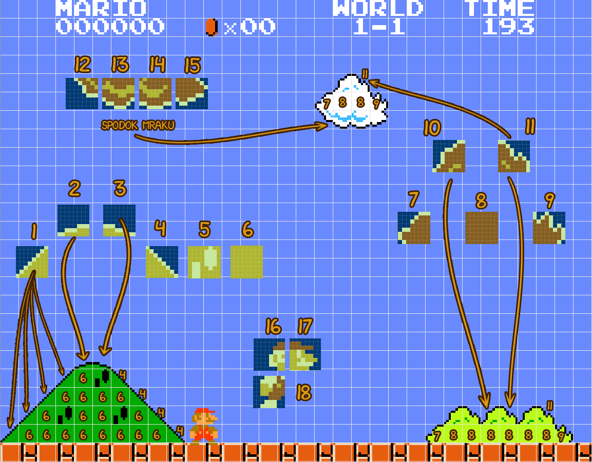 Pri behu alebo skoku napríklad Máriovi zostala hlava v podobe dvoch dlaždíc, ale spodné dve s jeho gaťami boli vymenené za iné. Skúsme si ich v tabuľke nájsť. A hľa, tuto sú: