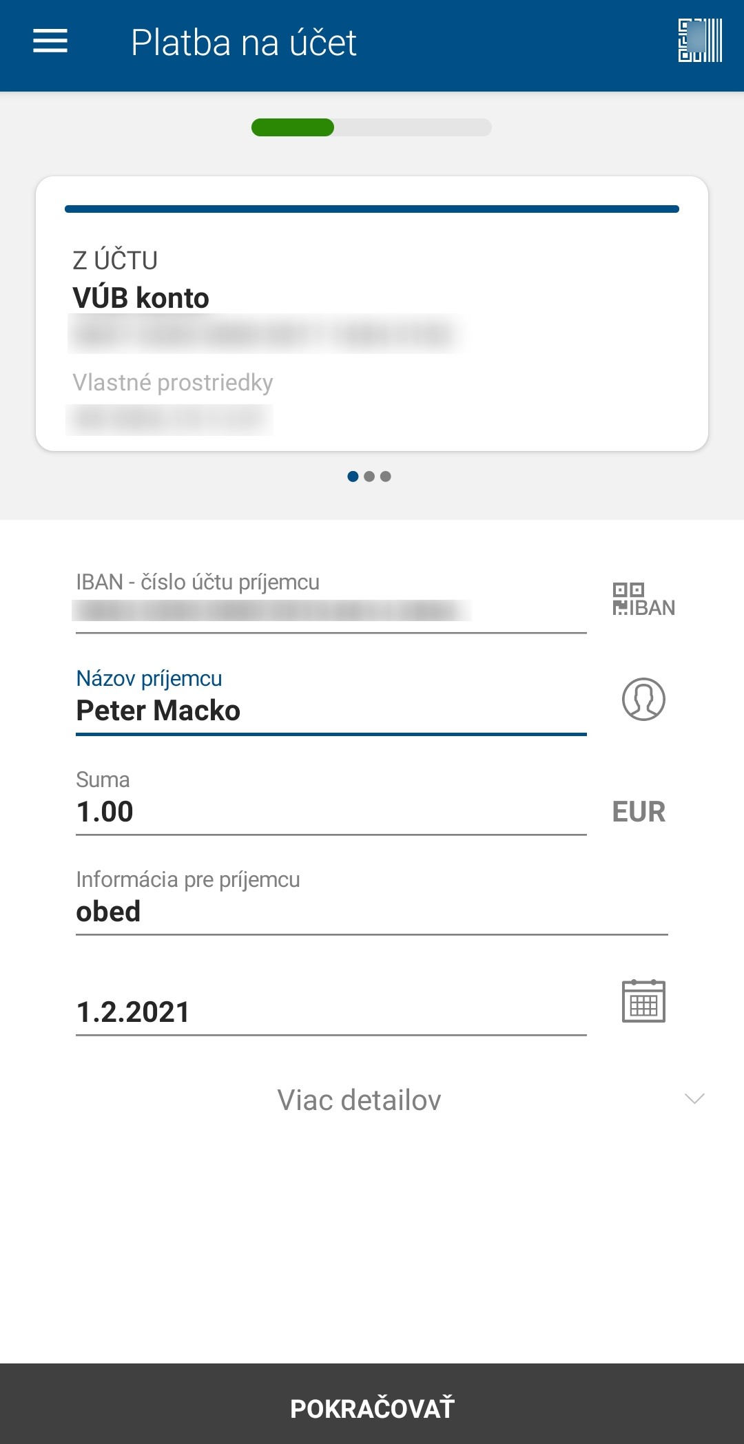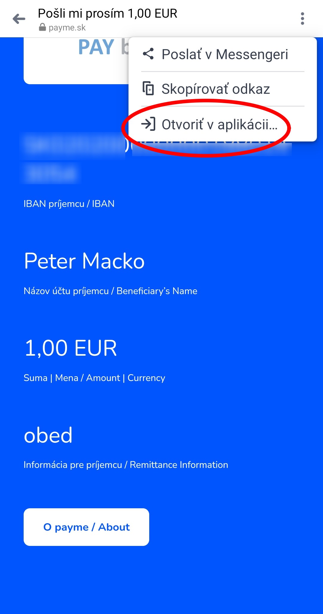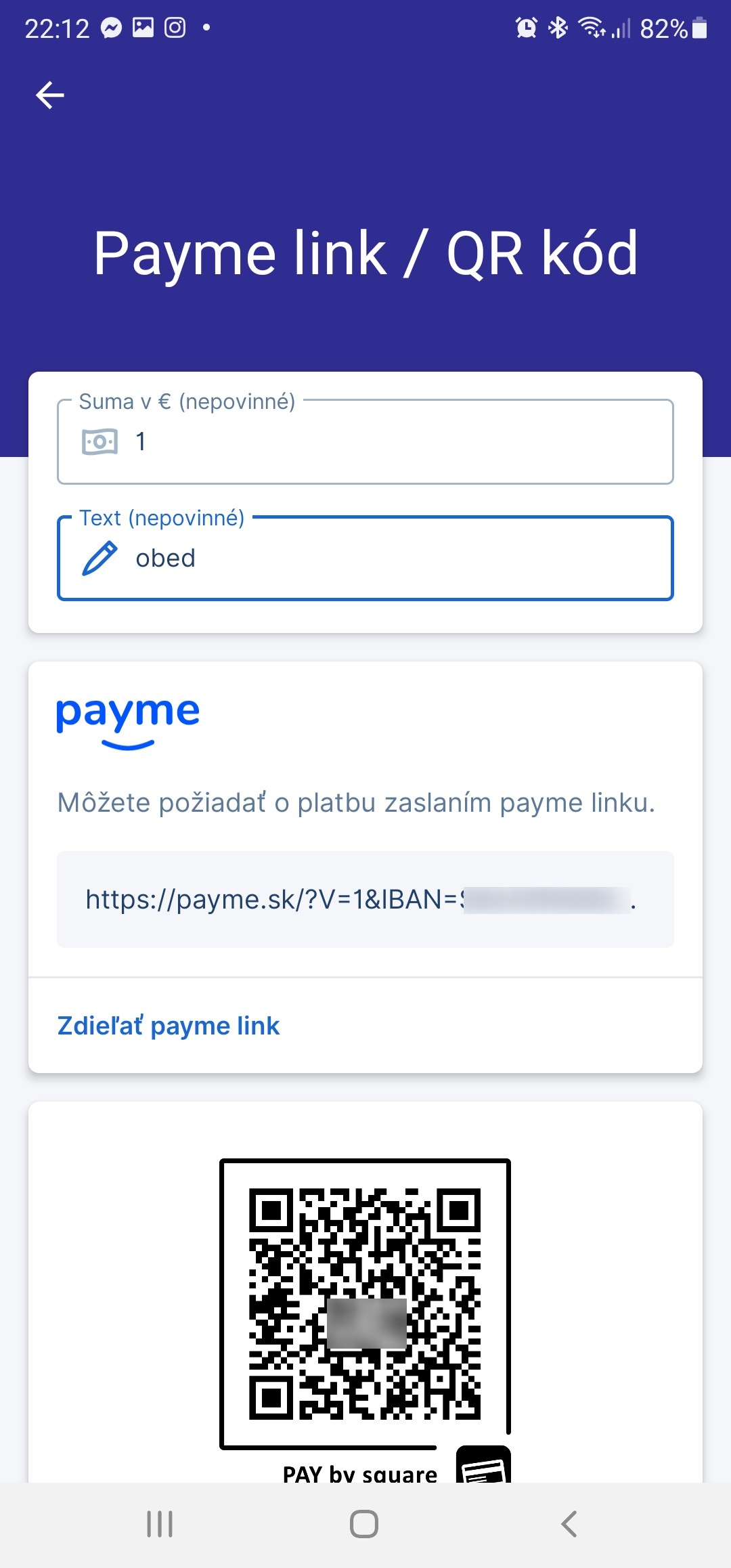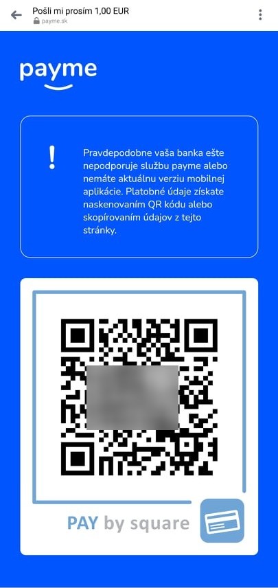 Vytvorenie odkazu. Ten vytvoríte na stránke www.payme.sk alebo v mobilnom bankovníctve banky zapojenie do systému Payme. My sme vyskúšali viacero prostredí bánk na Slovensku. Poslanie vytvoreného odkazu. Payme odkaz pošlete priateľovi napr. SMS, mailom alebo v nejakej četovacej aplikácii Zaplatenie. Platba závisí od toho, či váš priateľ používa banku zapojenú do Payme. My sme vyskúšali spôsob poslania odkazu cez Messenger. Po kliknutí na odkaz v mobile sa nám v prostredí Messengera zobrazilo hlásenie o tom, že pravdepodobne nemáme podporu pre systém Payme. Po zvolení možnosti Otvoriť v aplikácii a voľby použitého mobilného bankovníctva sa dostanete priamo do prostredia na platbu. Pokiaľ váš priateľ nepoužíva banku zapojenú do systému Payme, použije vygenerovaný platobný QR kódom – PAY by square. Platbu teda uhradí jednoducho jeho naskenovaním pomocou mobilného bankovníctva. Platba cez QR kód sa realizuje aj vtedy, ak na zaslaný link kliknete v počítači a nie v mobile. Výhodou celej služby je to, že sa do nej nemusíte nijako registrovať, stačí ju len použiť. Nikde nezadávate osobné údaje, čo je nevídané. Služba je pre klientov bánk zúčastnených v systéme payme zadarmo, za jej použitie sa nič neplatí. Je rýchla a pohodlná.Payme v Tatra banke