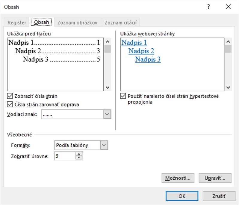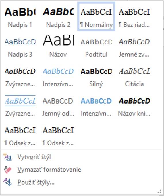 Skôr ako si obsah necháte generovať, mali by ste vedieť čo sú Štýly. Možno až teraz vám budú jednotlivé označenia ako Nadpis 1, Nadpis 2 atď. dávať zmysel. Pri tvorbe nadpisov ich treba používať v závislosti na hierarchii v dokumente. Na základe nich bude funkcia na tvorbu obsahu rozpoznávať, ako má nadpisy odsadiť a priradiť im veľkosť.