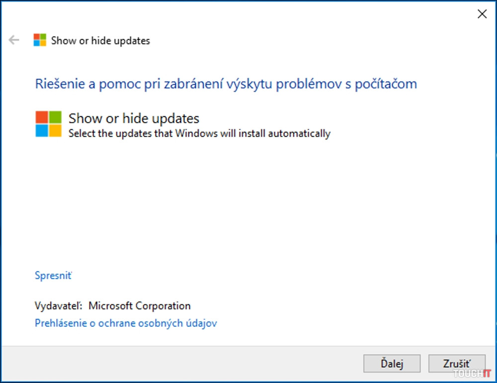 Nástroj si stiahnite napríklad na pracovnú plochu a spustite. Program automaticky vyhľadá aktuálne dostupné aktualizácie, pripravené na stiahnutie a inštaláciu. Po skončení kliknite na možnosť Hide updates (skryť aktualizácie) a vyberte tú, ktorá vám robí ťažkosti. Následne kliknite už len na tlačidlo Ďalej, čím sa aktualizácia zakáže.