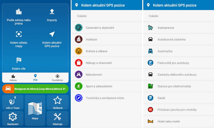 Body záujmu sa, samozrejme, zobrazujú na mape pri jej prezeraní. To však nie je všetko. Navigátor umožňuje aj ich vyhľadávanie a to prostredníctvom už záložky POI v hlavnej ponuke. S nájdeným bodom záujmu si môžete vybrať z rôznych akcií, ktoré chcete s bodom záujmu vykonať, napríklad nastaviť ho ako cieľ a navigovať k nemu, pridať ho ako bod trasy, uložiť ho ako obľúbený alebo si ho ponechať zobraziť ho na mape.