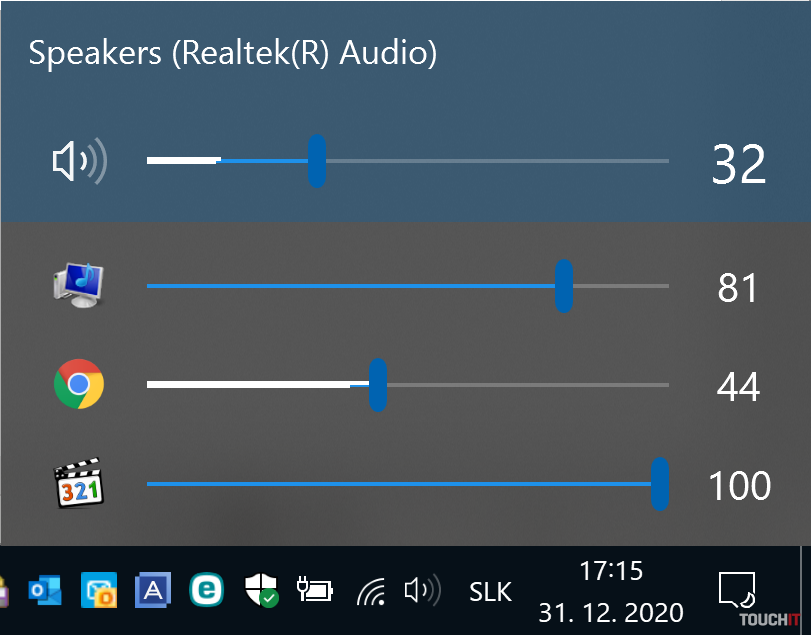 Vlastne ide o presunutie možností Zmiešavača zvuku do panela, ktorý slúži na bežné nastavenie hlasitosti. V základe, keď kliknete na ikonu reproduktora, zobrazí sa panel na globálne nastavenie hlasitosti. Keď ale chcete upraviť hlasitosť samostatne pre Chrome, Media Player Home Cinema či inú aplikáciu využívajúcu v danom momente zvuk, treba ísť do zmiešavača.
