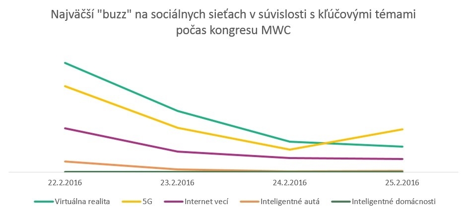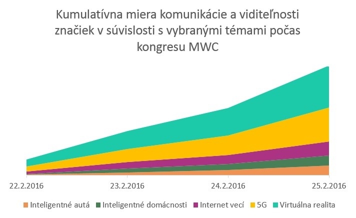 Na základe analýzy bolo identifikovaných päť kľúčových tém, ktoré počas MWC 2016 najviac zarezonovali – virtuálna realita, 5G, inteligentné domácnosti (connected home), inteligentné autá (connected cars) a internet vecí (IoT). Kto nakoniec vyhral boj o pozornosť? Kto si počínal v komunikácii najlepšie? Kto vytvoril na sociálnych sieťach najväčší rozruch? A kto viedol vo vyhľadávaní?