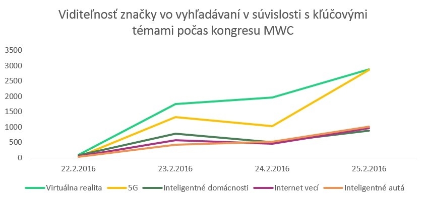 To, o čom sa píše na sociálnych sieťach má dnes značný vplyv na obsah spravodajských portálov, čo sa okamžite prejaví aj vo vyhľadávaní. Výsledkom je nakoniec zvýšená viditeľnosť značky. Takže možno povedať, že spoločnosť Samsung zvolila tú správnu stratégiu ako urobiť veľké „haló“, a to hneď na začiatku (v zmysle stratégie „go big, go early“). Tým nastolila agendu aj na zvyšok týždňa. V grafe nižšie možno vidieť, že virtuálna realita zostala dominantnou témou na sociálnych sieťach až do posledného dňa kongresu, kedy sa o rozruch postarala technológia 5G. Obdobný trend vidieť aj vo vyhľadávaní.