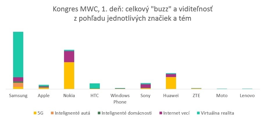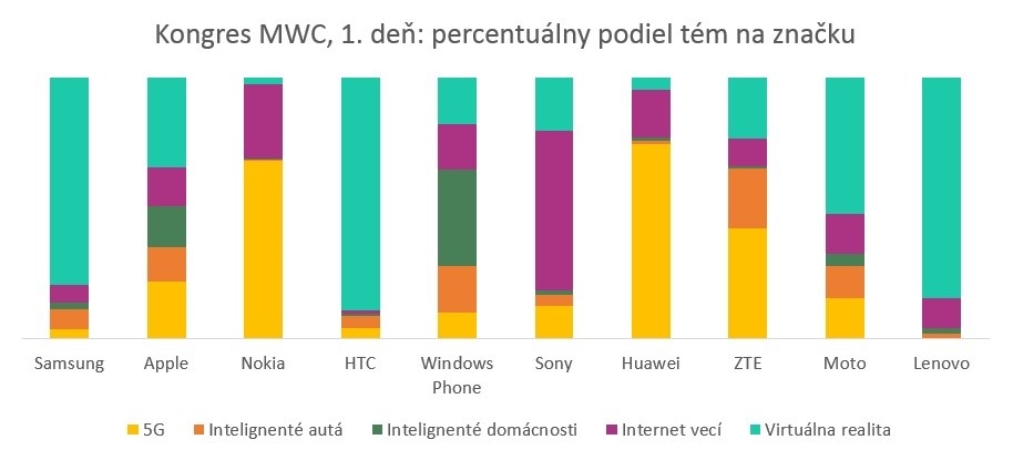 Ku koncu prvého dňa kongresu MWC si práve Samsung zabezpečil najväčšiu viditeľnosť spomedzi všetkých značiek, a to najmä v spojitosti s virtuálnou realitou a aj vďaka Zuckerbergovmu kúsku. Ostatné značky sa len veľmi vzdialene pokúšali priblížiť k Samsungu čo do počtu zmienok a dosahu. Nižšie vidíme, v akom rozsahu sa jednotlivé značky venovali 5 kľúčovým témam v prvý deň kongresu.